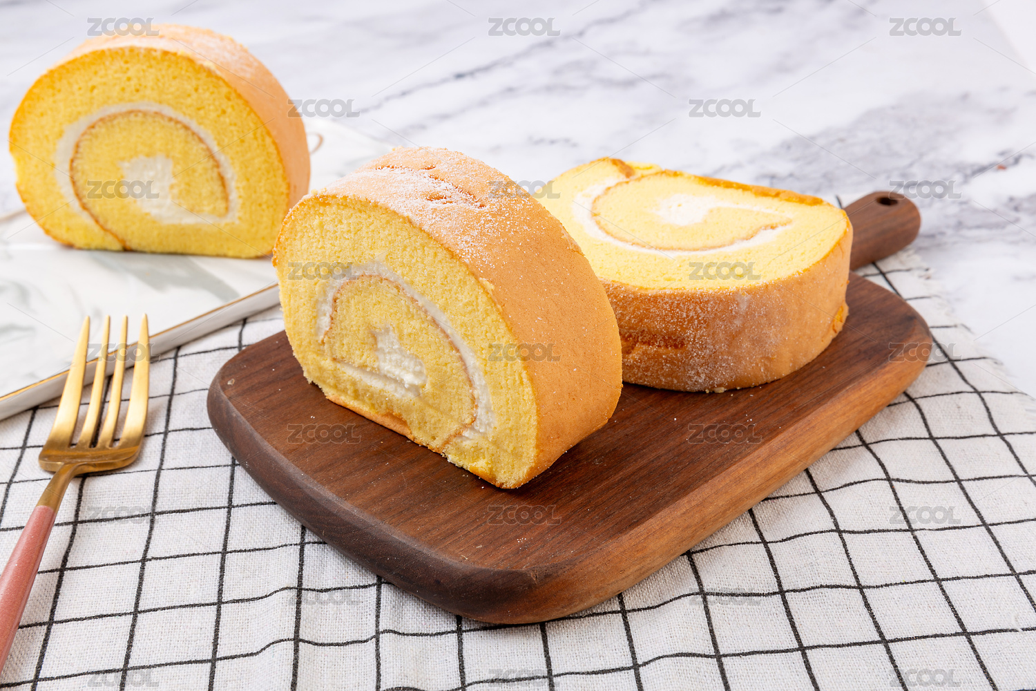 一盘鲜牛乳蛋糕卷摆放在桌面上特写
