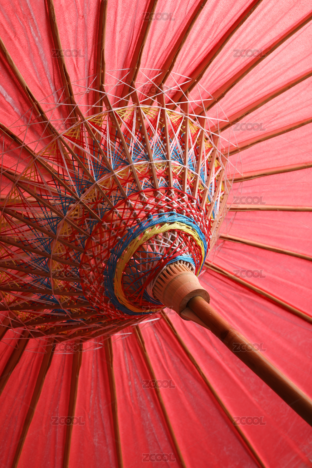 撑开的红色油纸伞内部支架特写