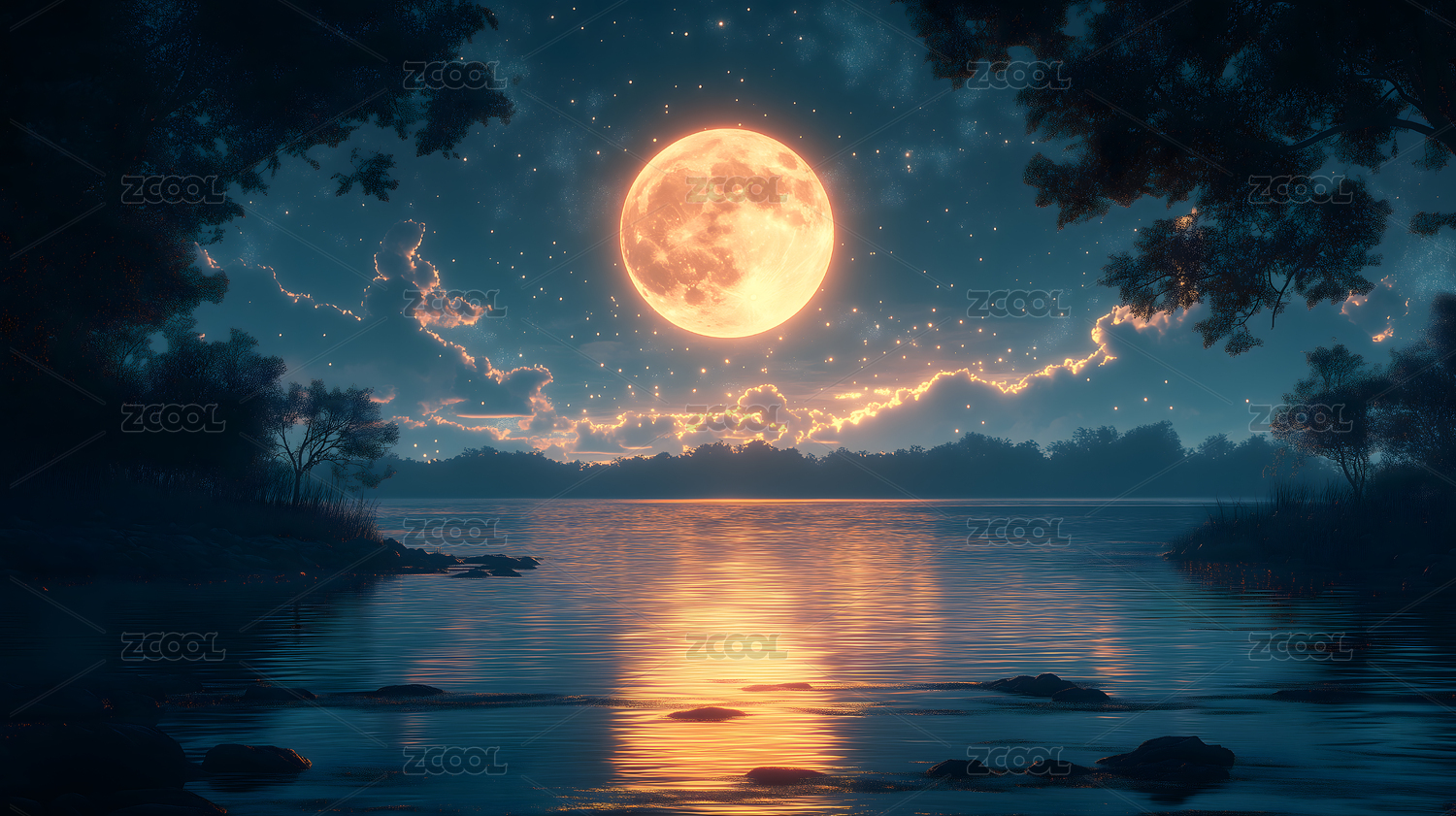 满月之夜静谧湖景星空