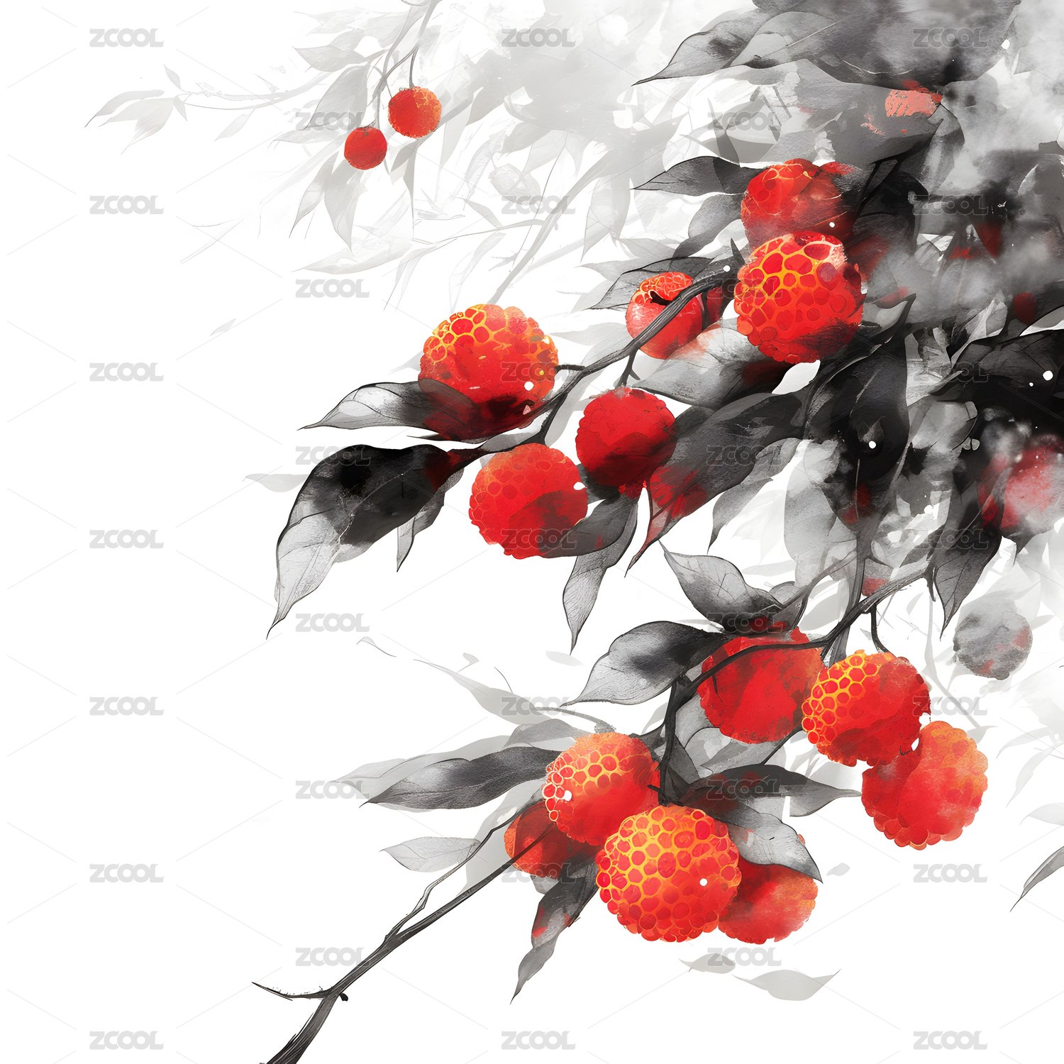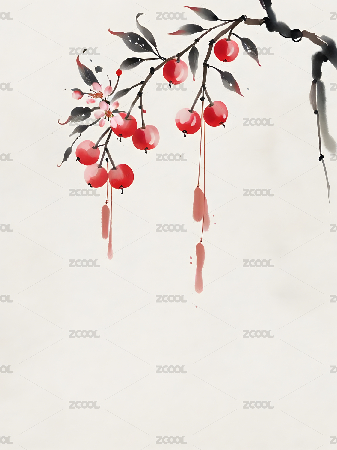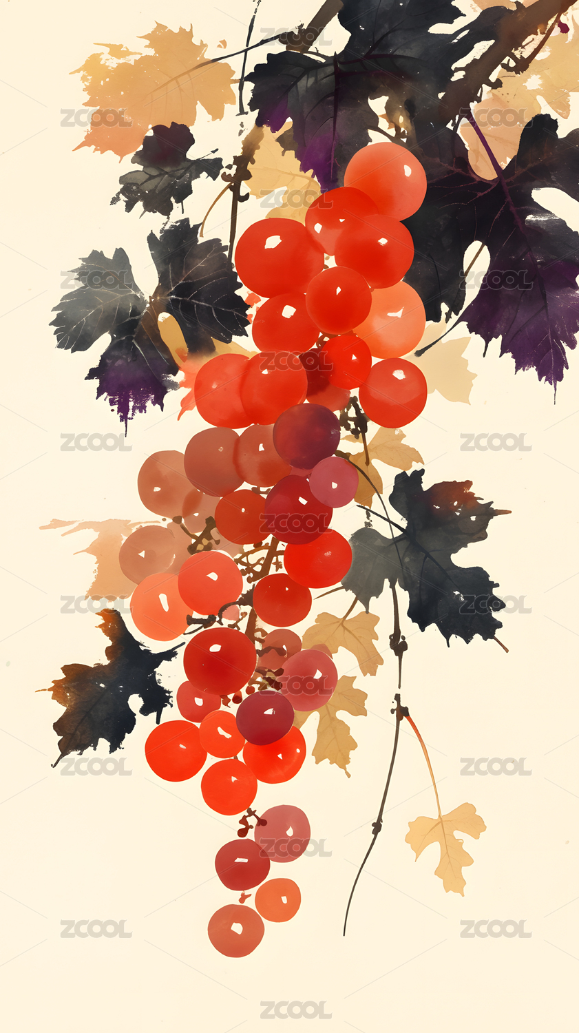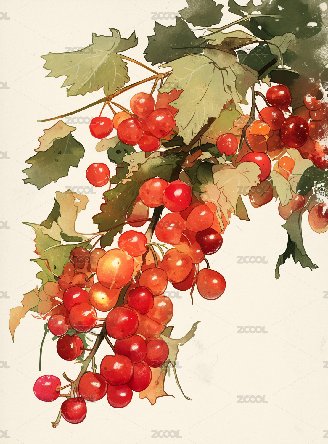 AIGC202402,秋天,水墨画,插画,食物,水果,树叶,叶子,树,果子