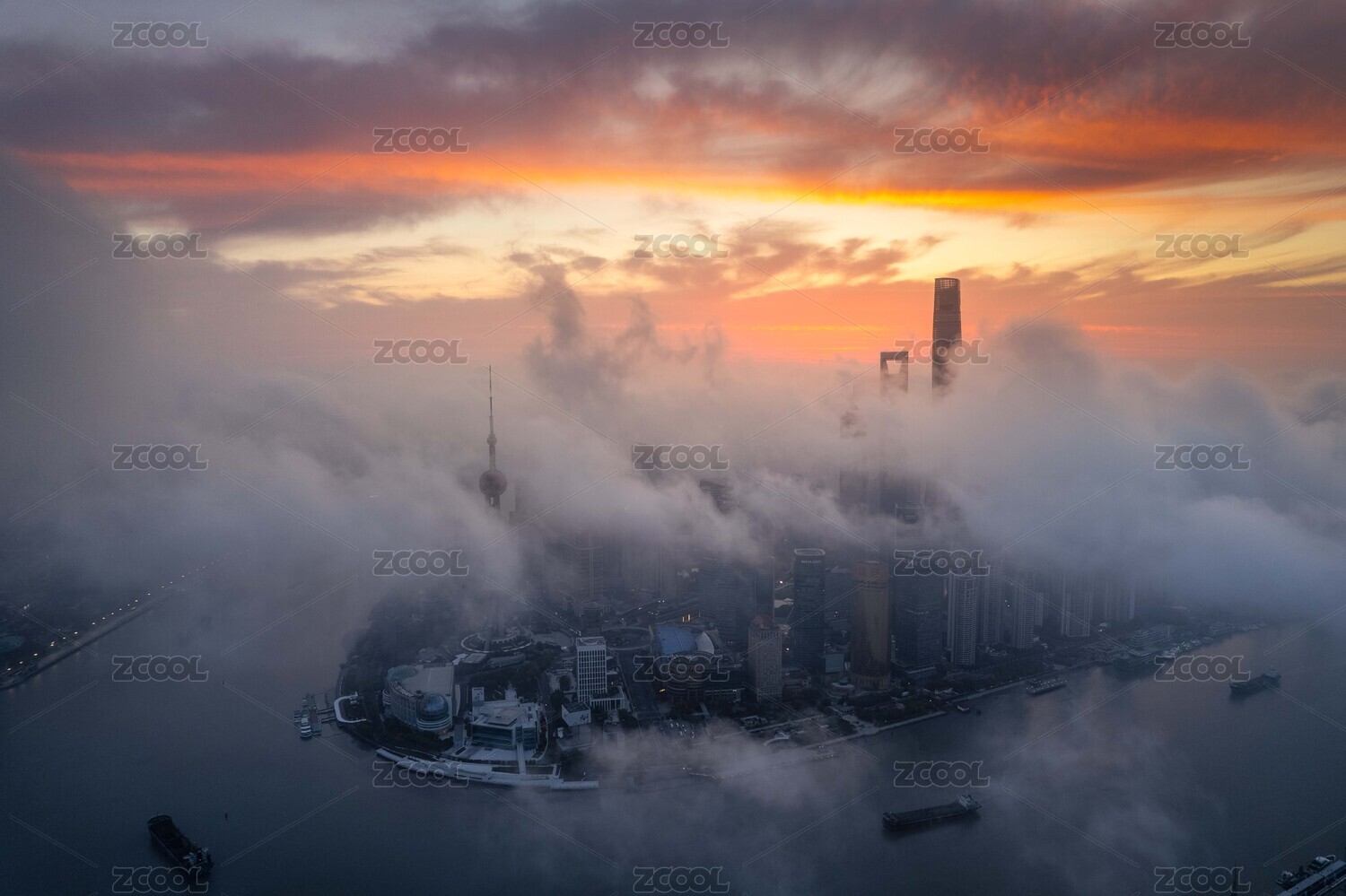 中国上海浦东陆家嘴地标建筑群平流雾航拍