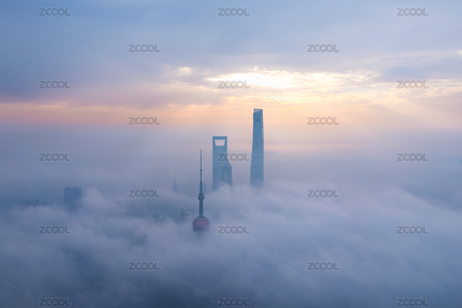 航拍日出时被云雾环绕的陆家嘴建筑群