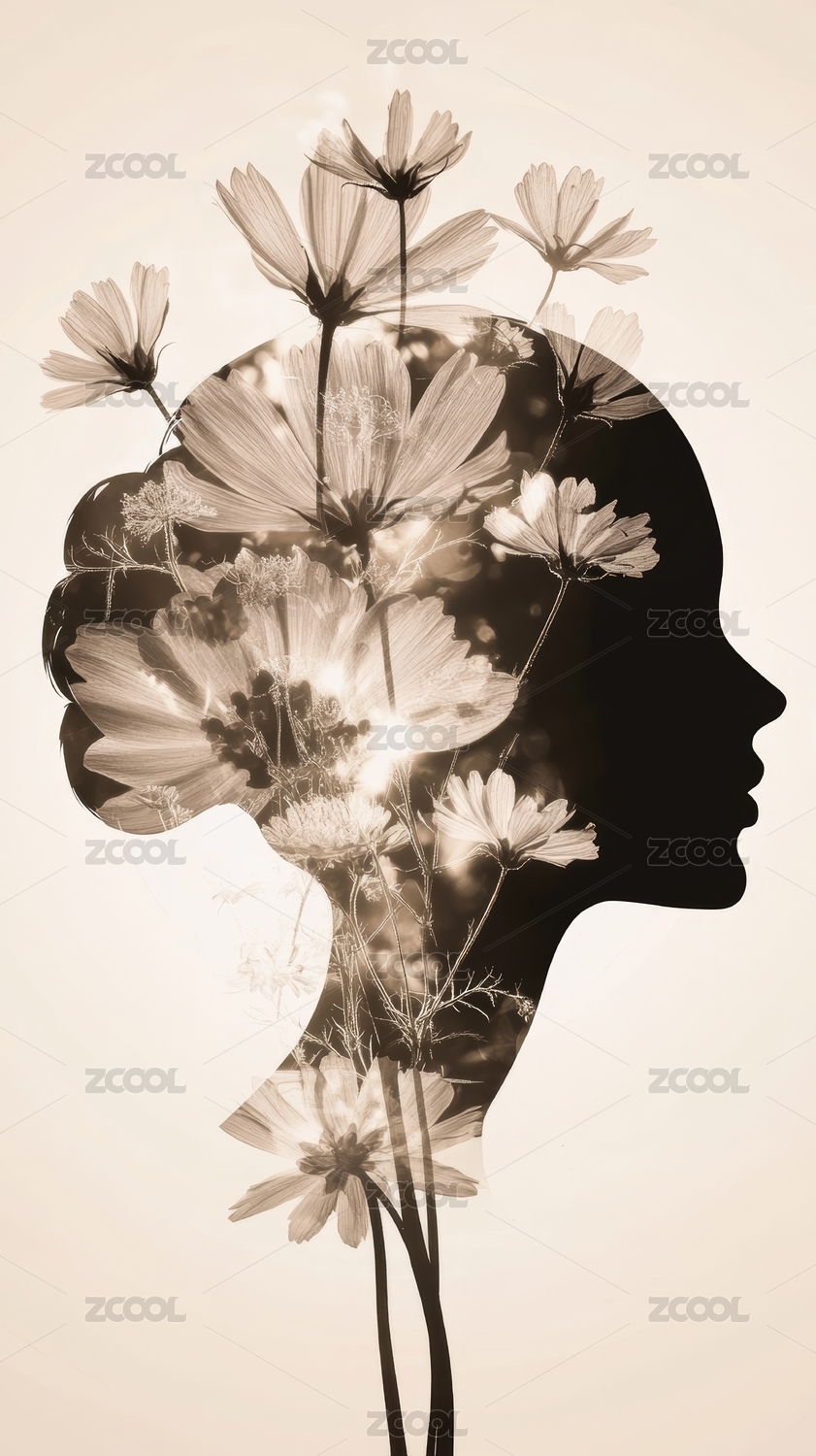 人像花朵二次曝光拼贴水彩复古时尚插画背景