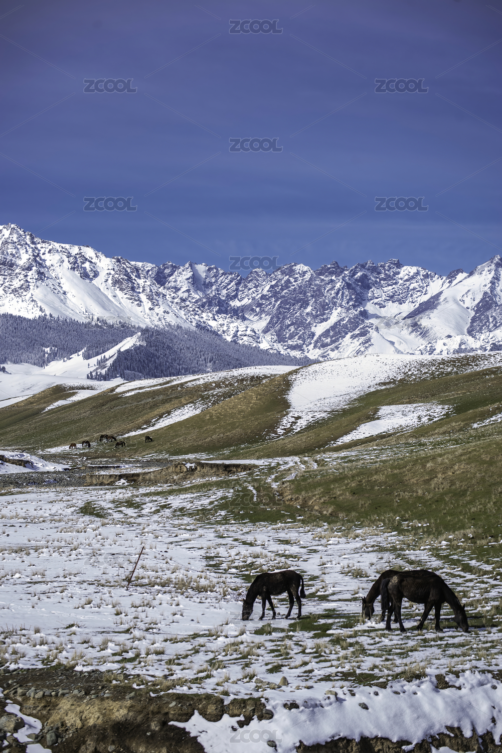 中国新疆伊犁翻越乌孙山缓坡草地和一匹马