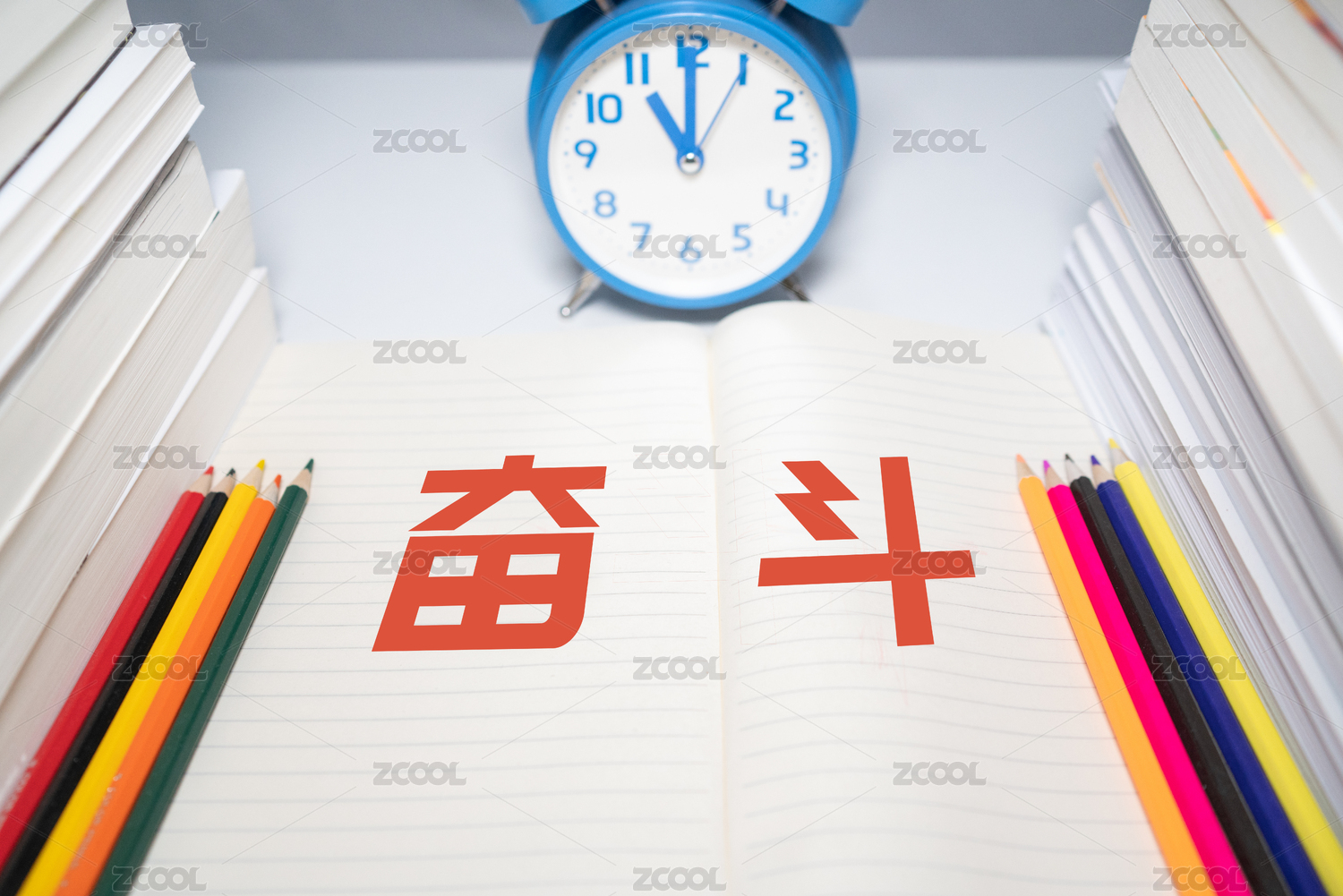 闹钟和书籍与笔记本,象征高效利用时间增加自己的学习效率和坚持不懈的努力拼搏,达到目标
