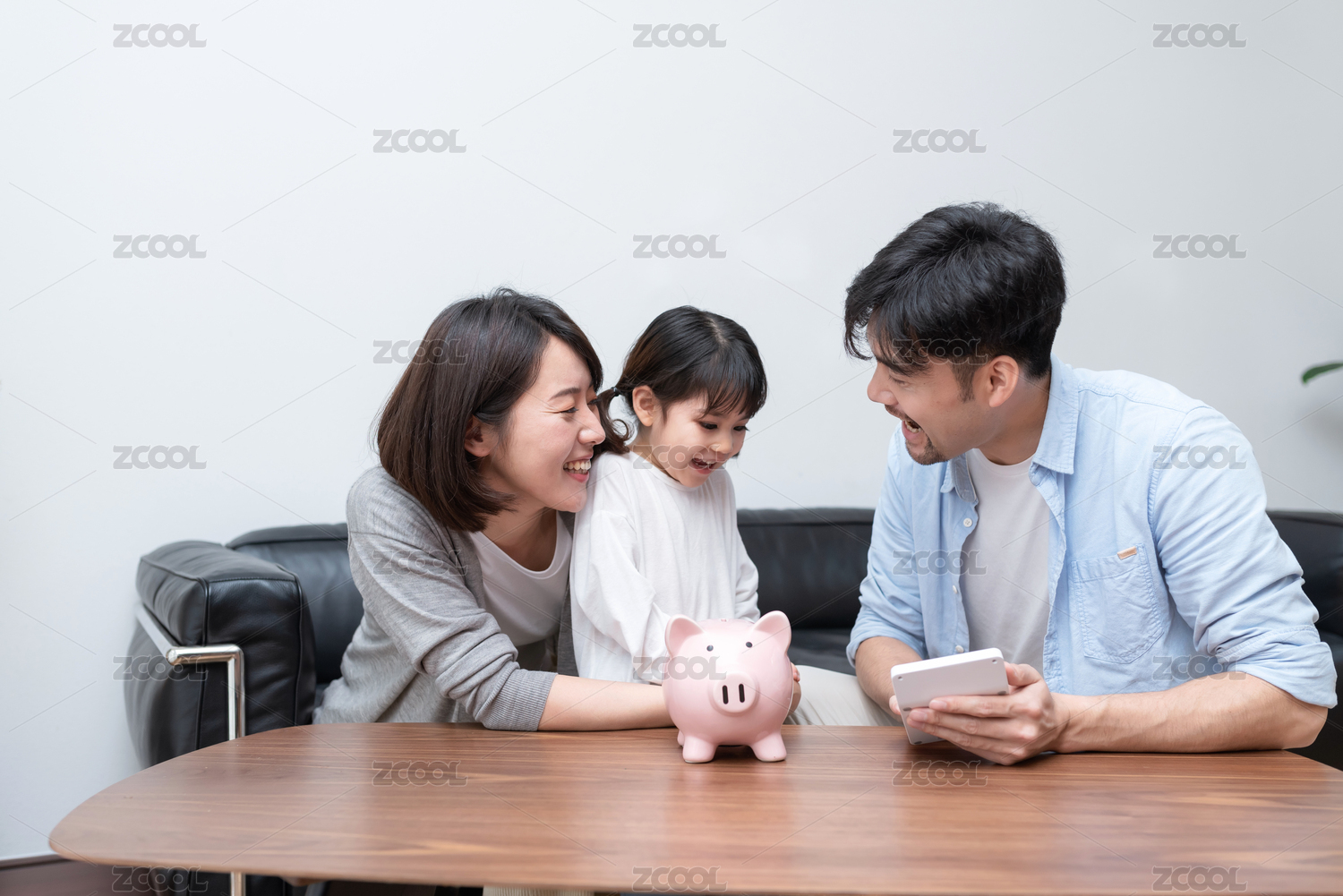 年轻的亚洲爸爸妈妈正在和女儿一起存钱