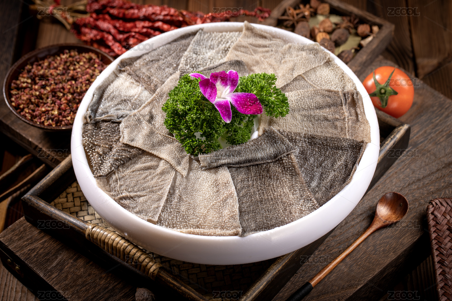 深色桌上白盘里的重庆老火锅菜品冰冻耗儿鱼