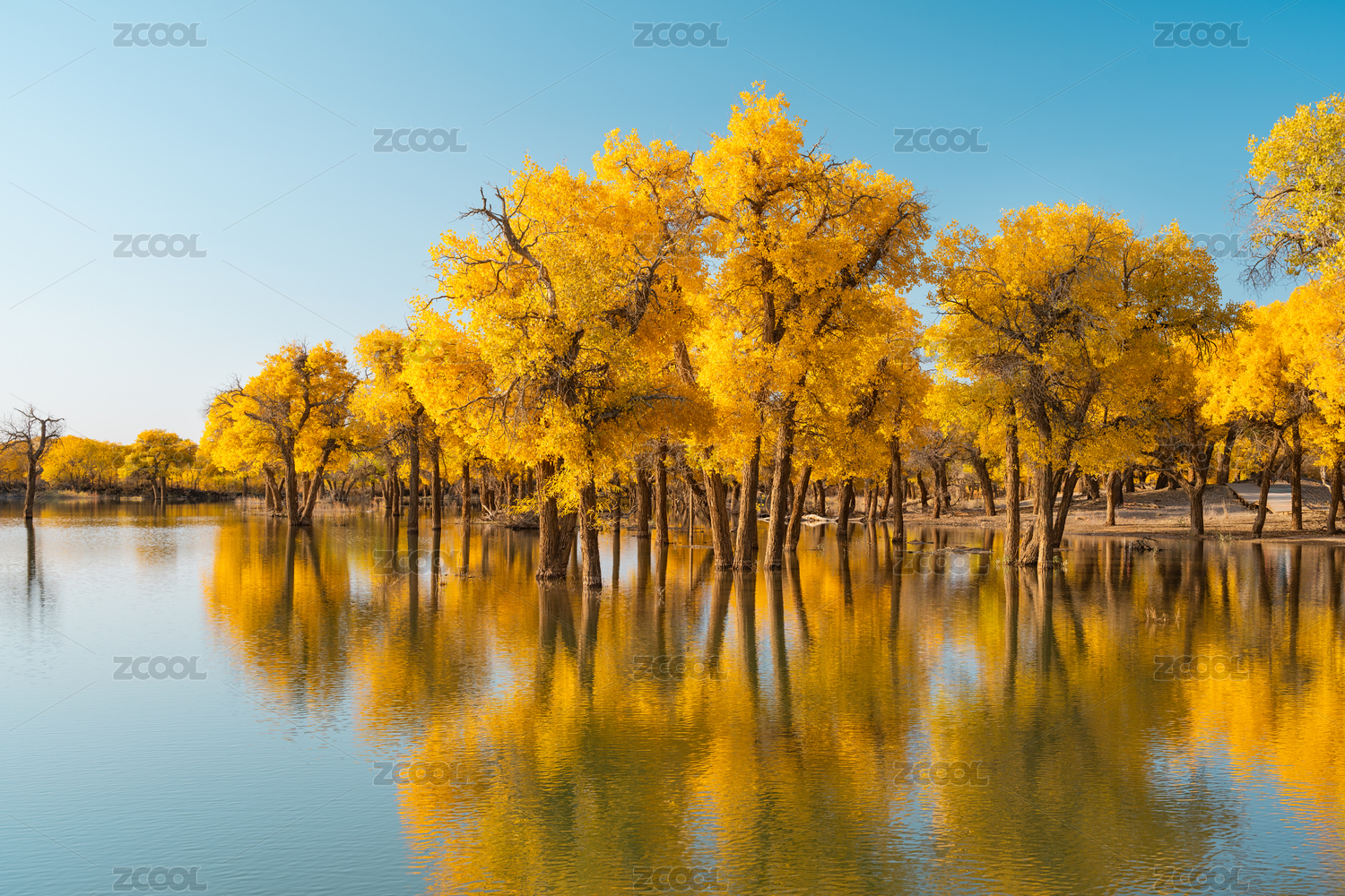 中国酒泉金塔秋天金黄色胡杨林水面光影