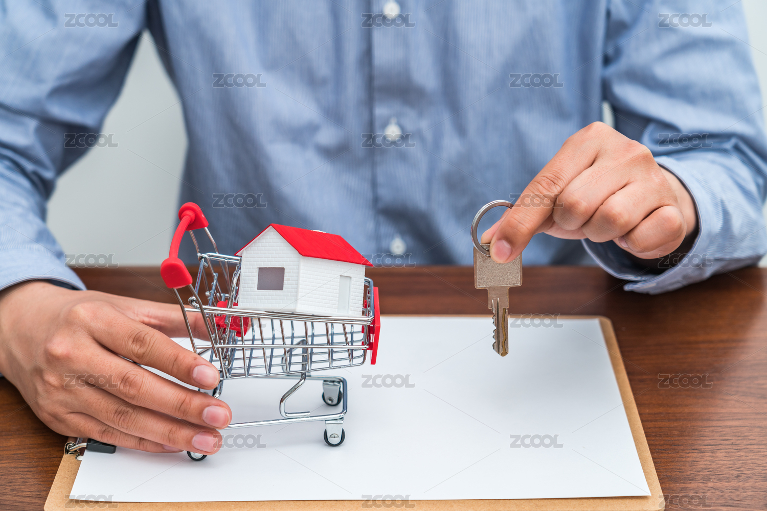 房地产经纪人手拿楼房钥装和装有房子模型的购物车