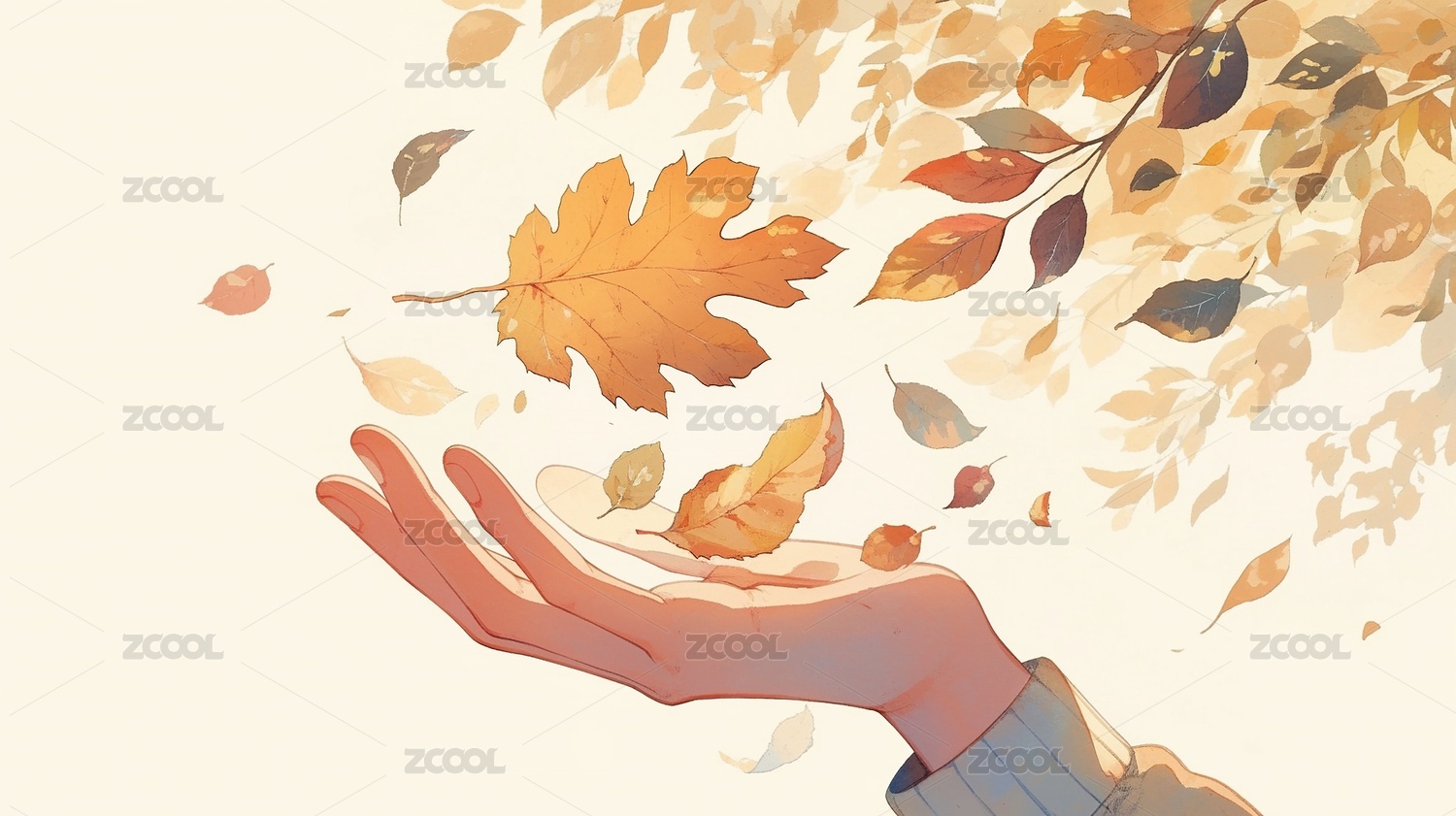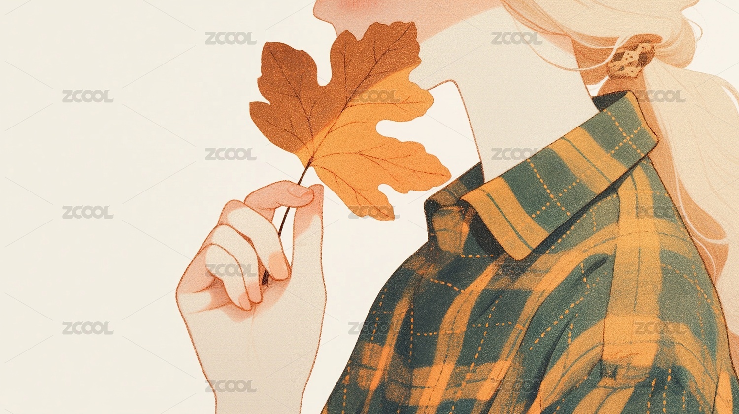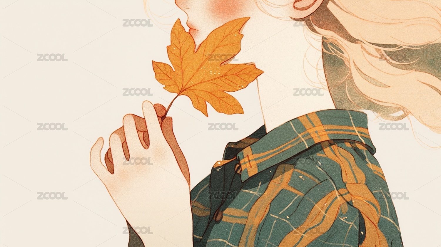 国风,女人,插画,户外,叶子,特写,植物,秋天,枫叶,水彩