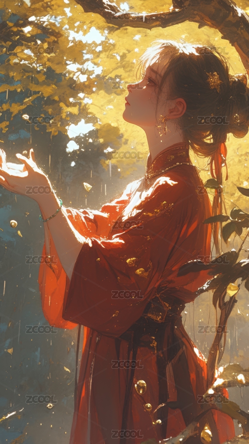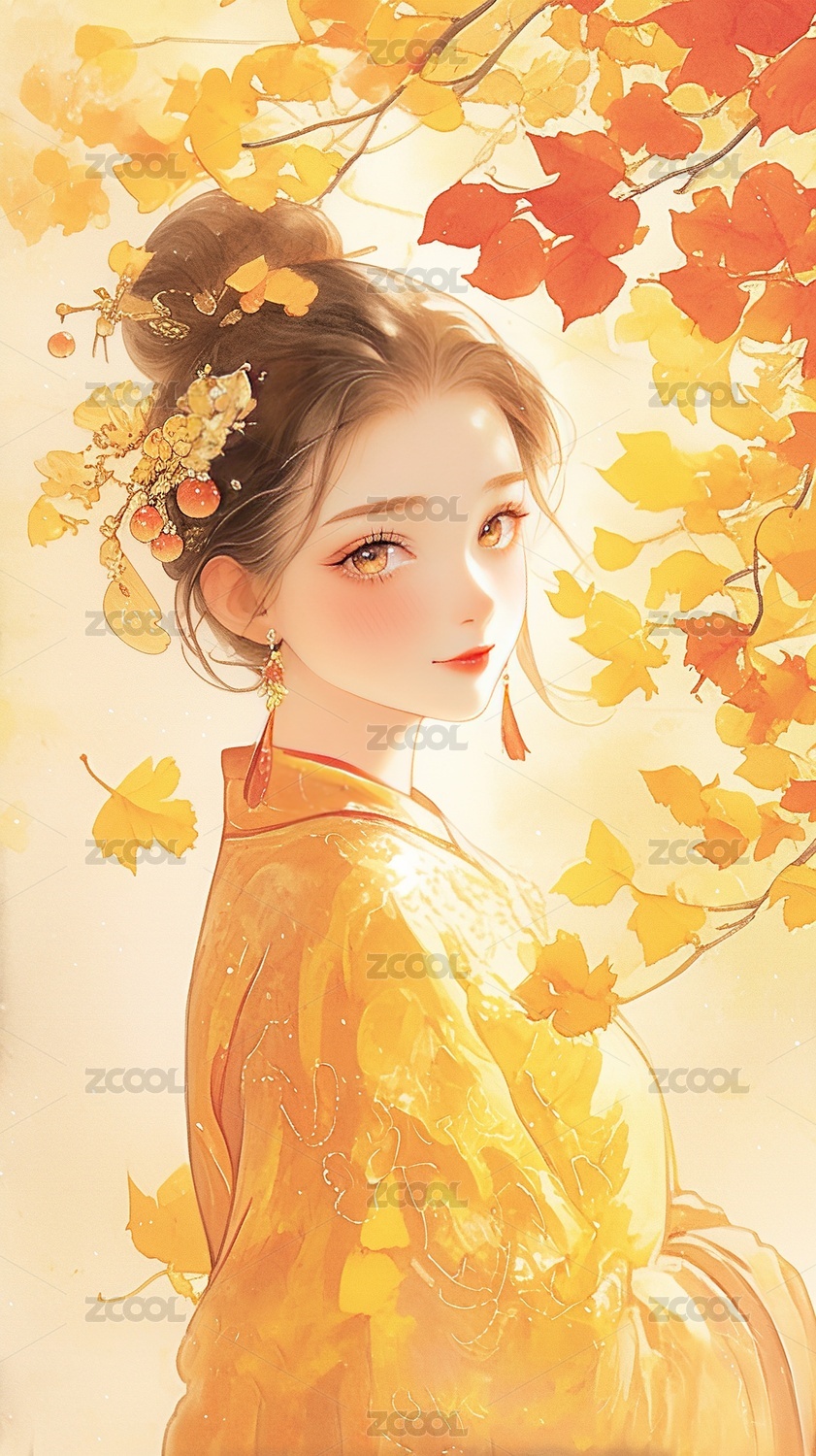 黄衣女子在金叶中回眸