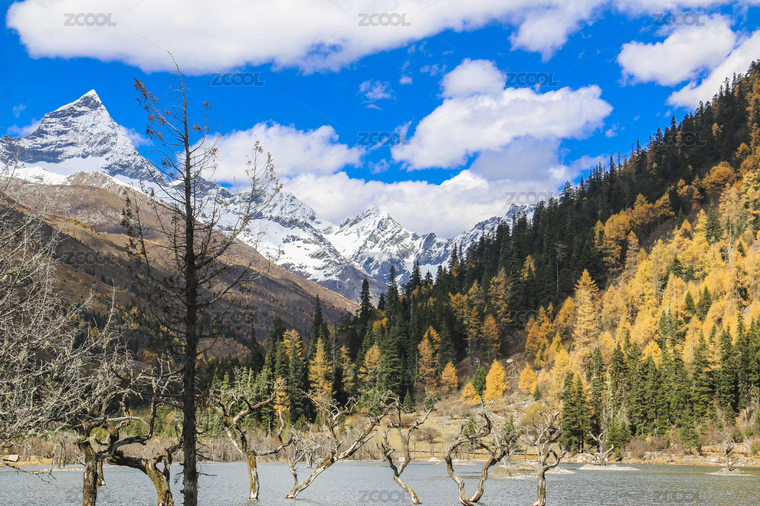 四姑娘山双桥沟秋季雪山彩林碧水景观