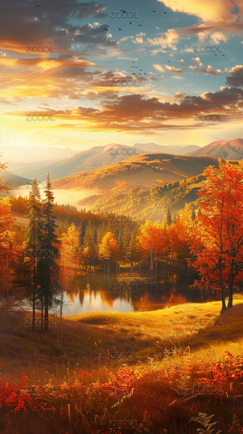 金秋山峦晚霞美景