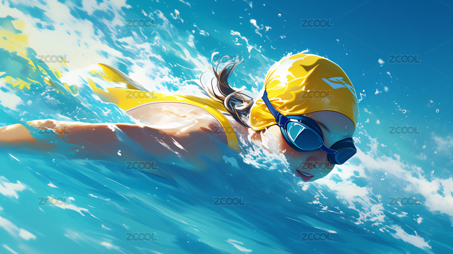 夏天清新明亮戴泳帽泳镜游泳的女孩