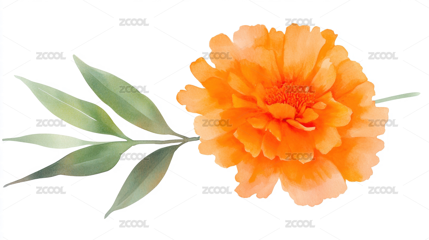 手绘橙色菊花与绿色叶子图案