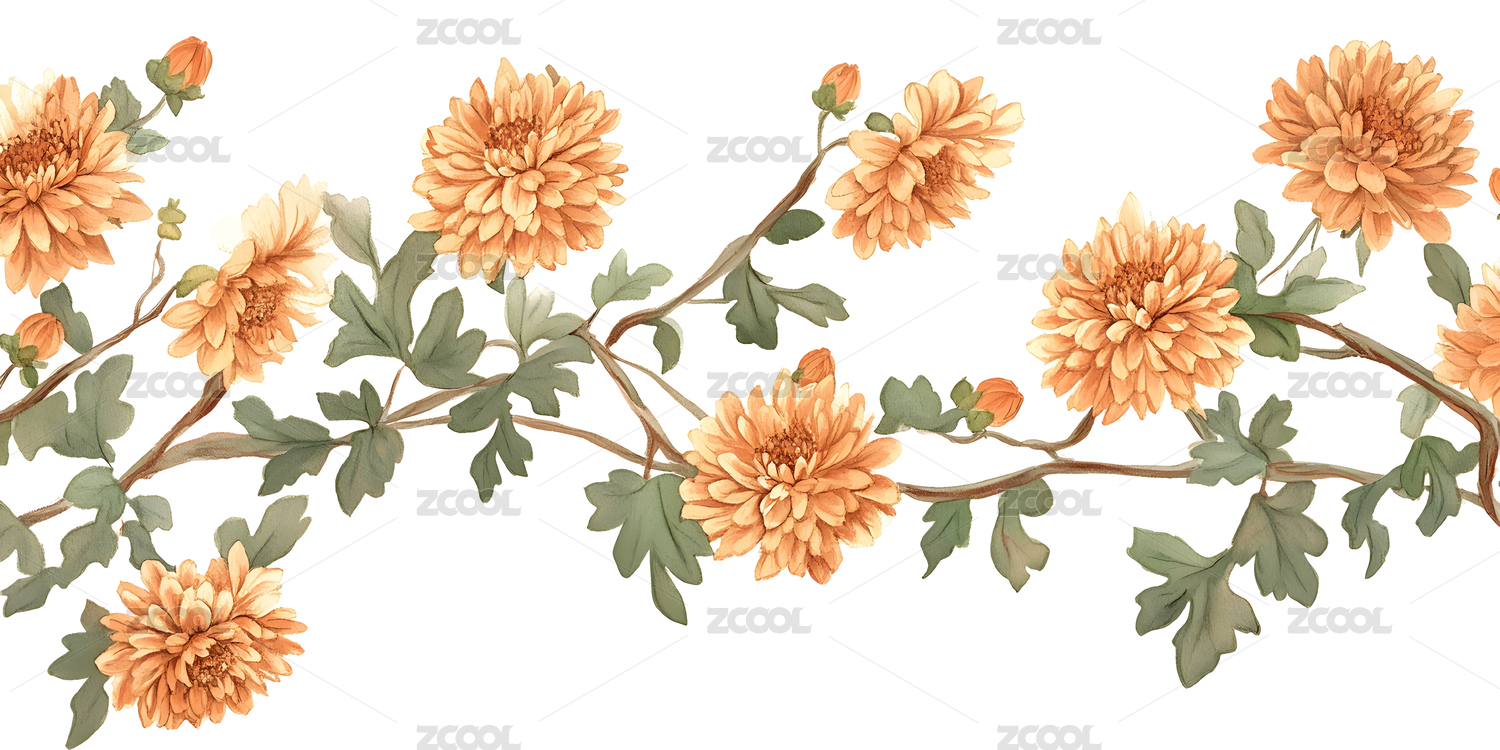 手绘橙色菊花枝条装饰图案