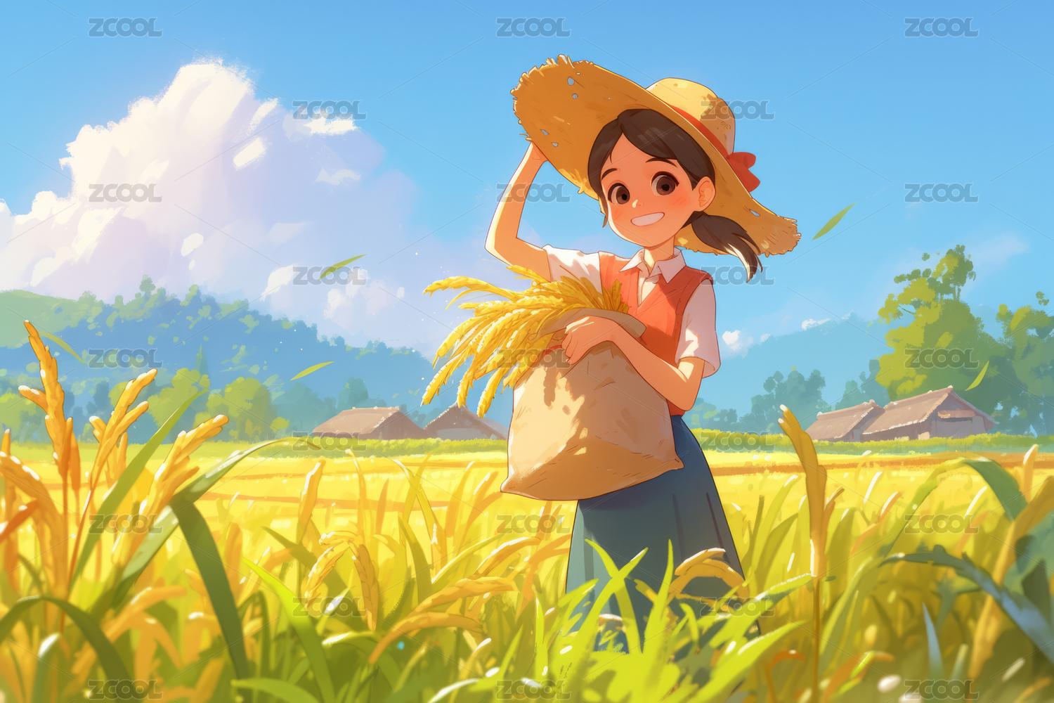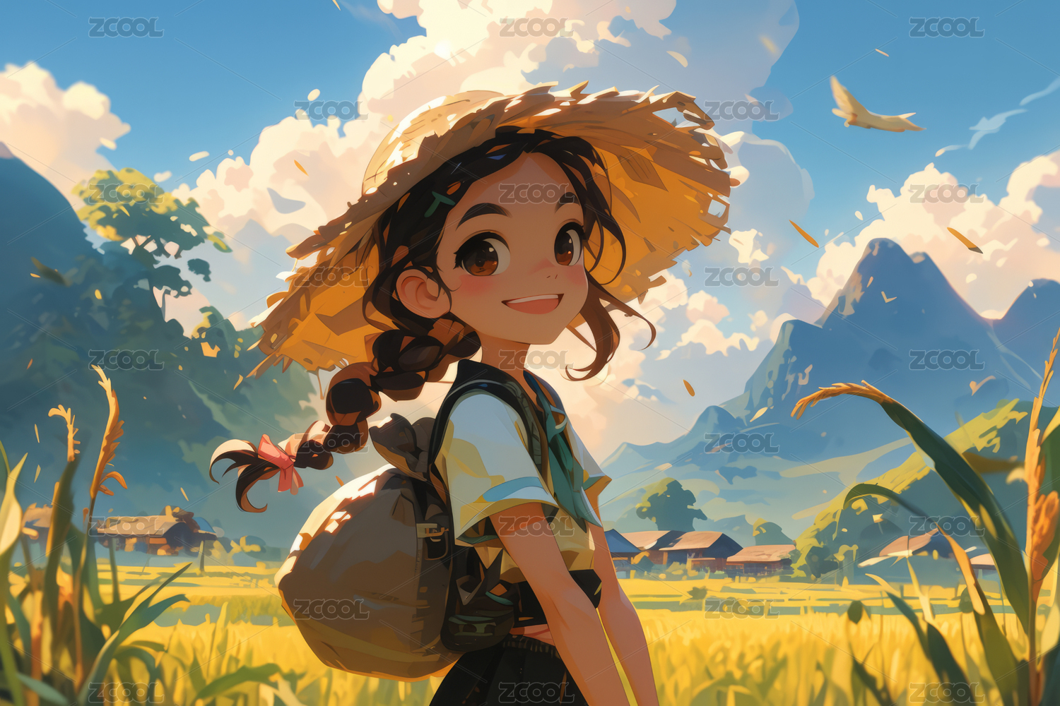 人物站在金色的庄稼地里,戴着草帽,背着收