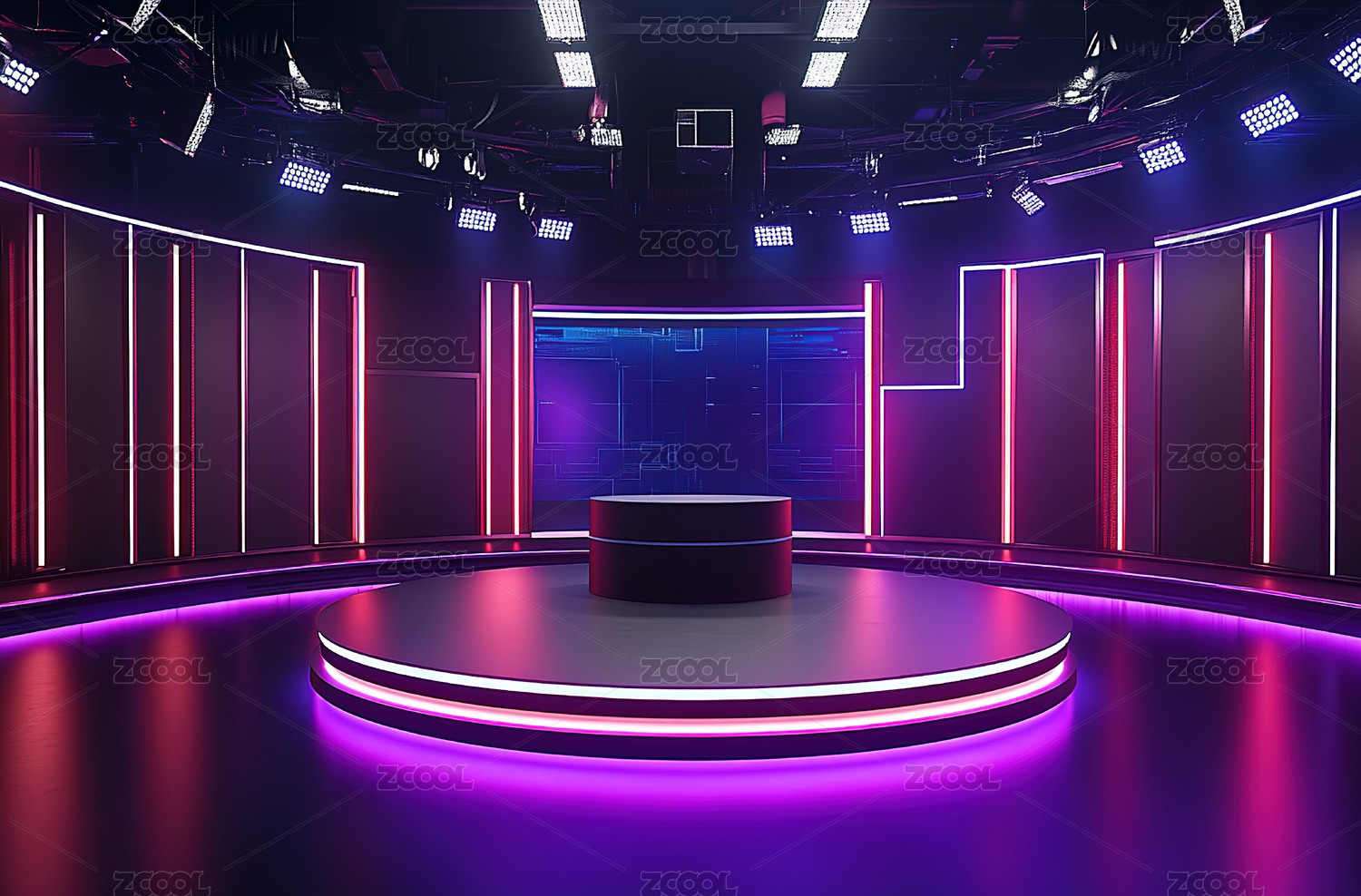 圆形舞台的蓝紫霓虹柱