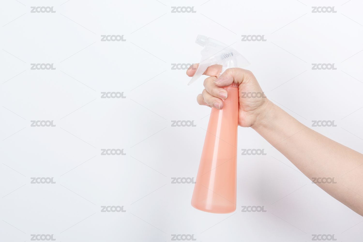 白色背景前年轻女性的手握住一瓶透明消毒液