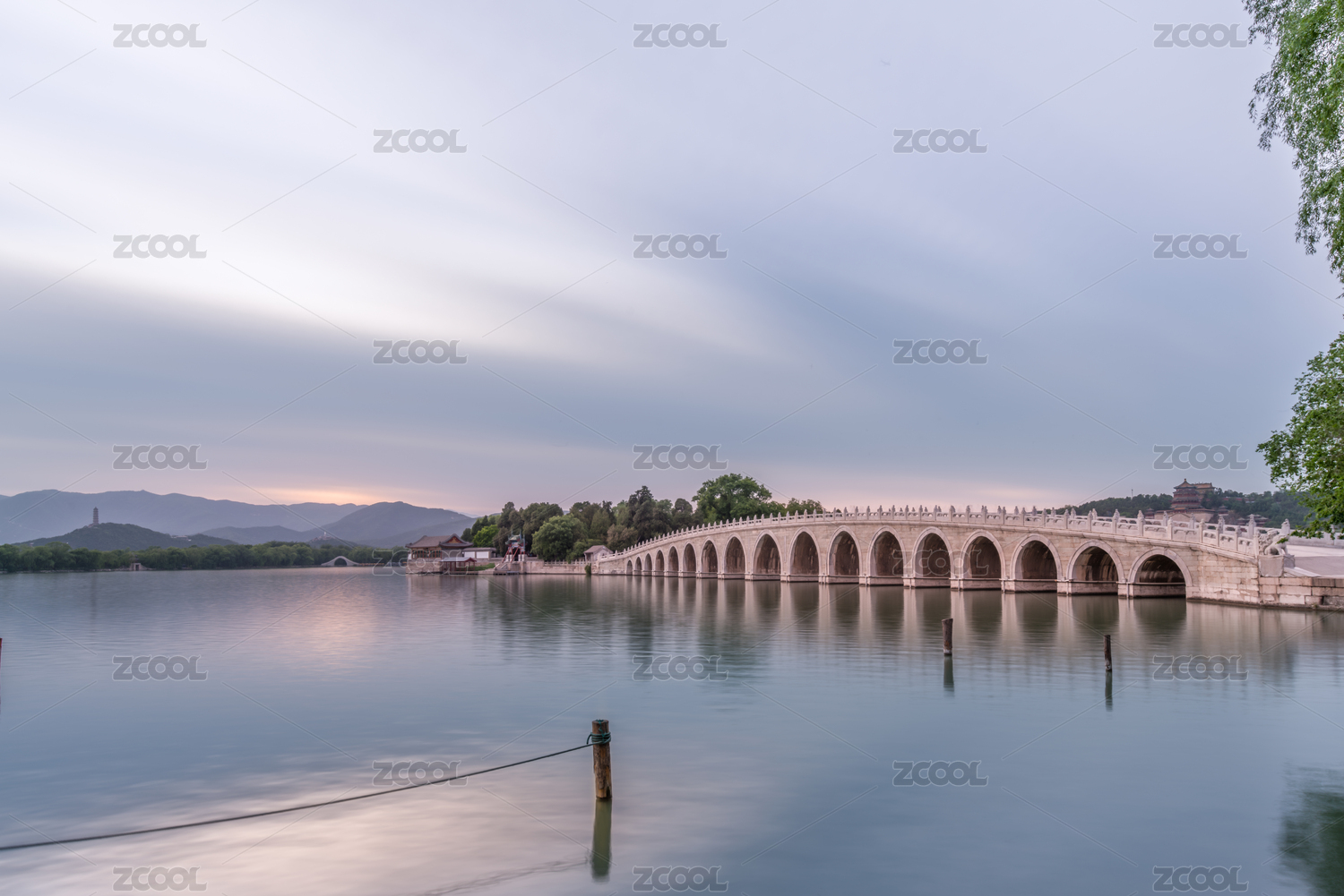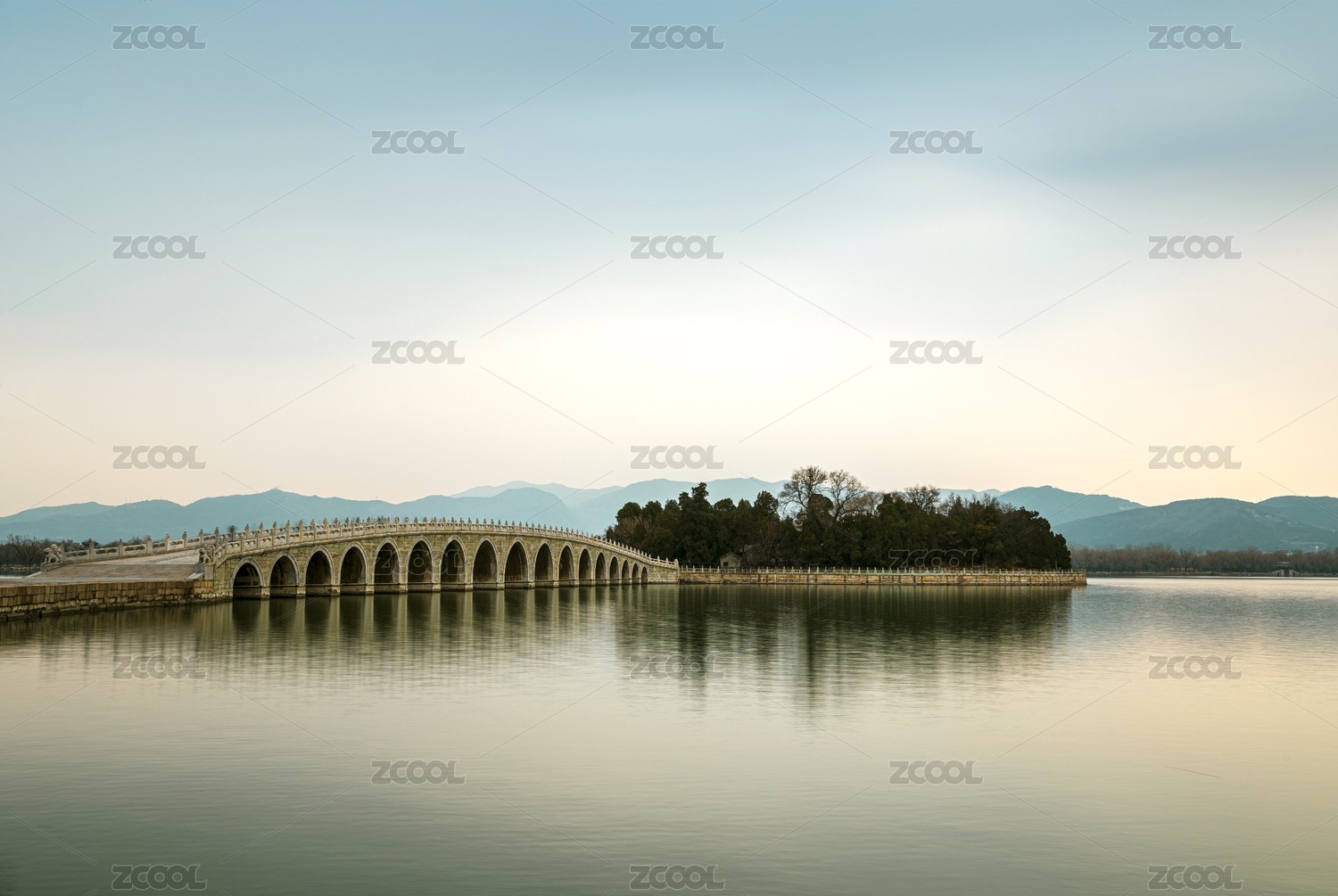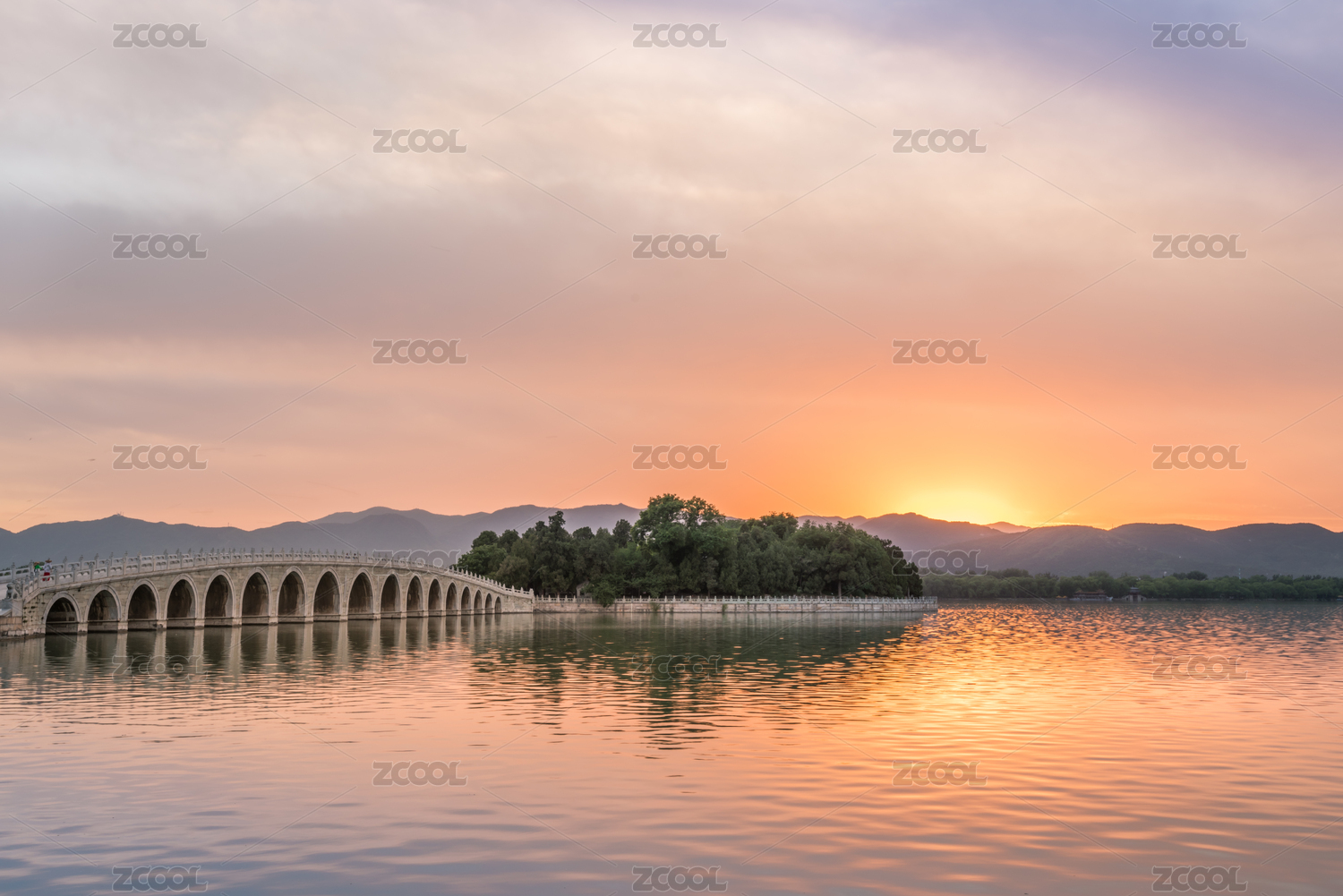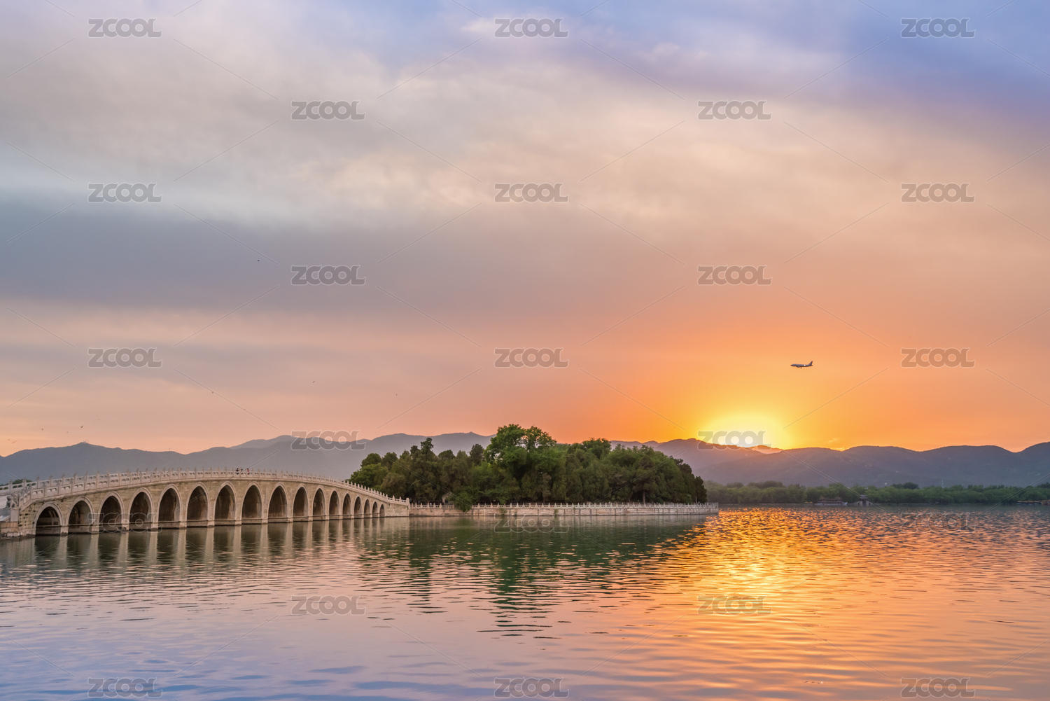 夕阳下的中国北京颐和园的湖泊园林建筑