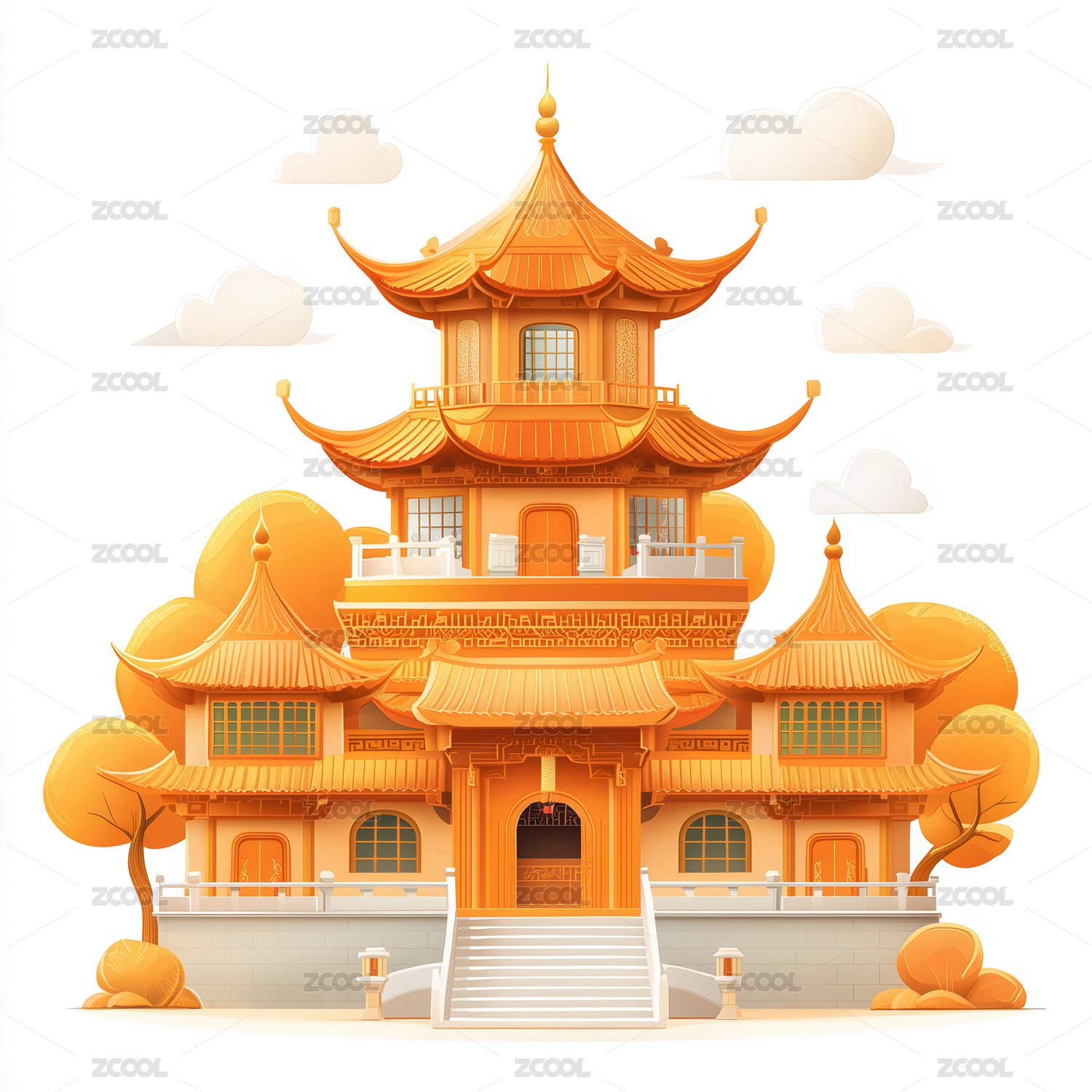 国潮风格古建筑插画素材