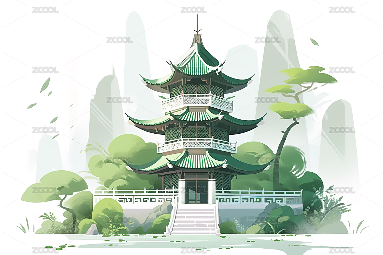 绿色系中国传统园林庭院插画