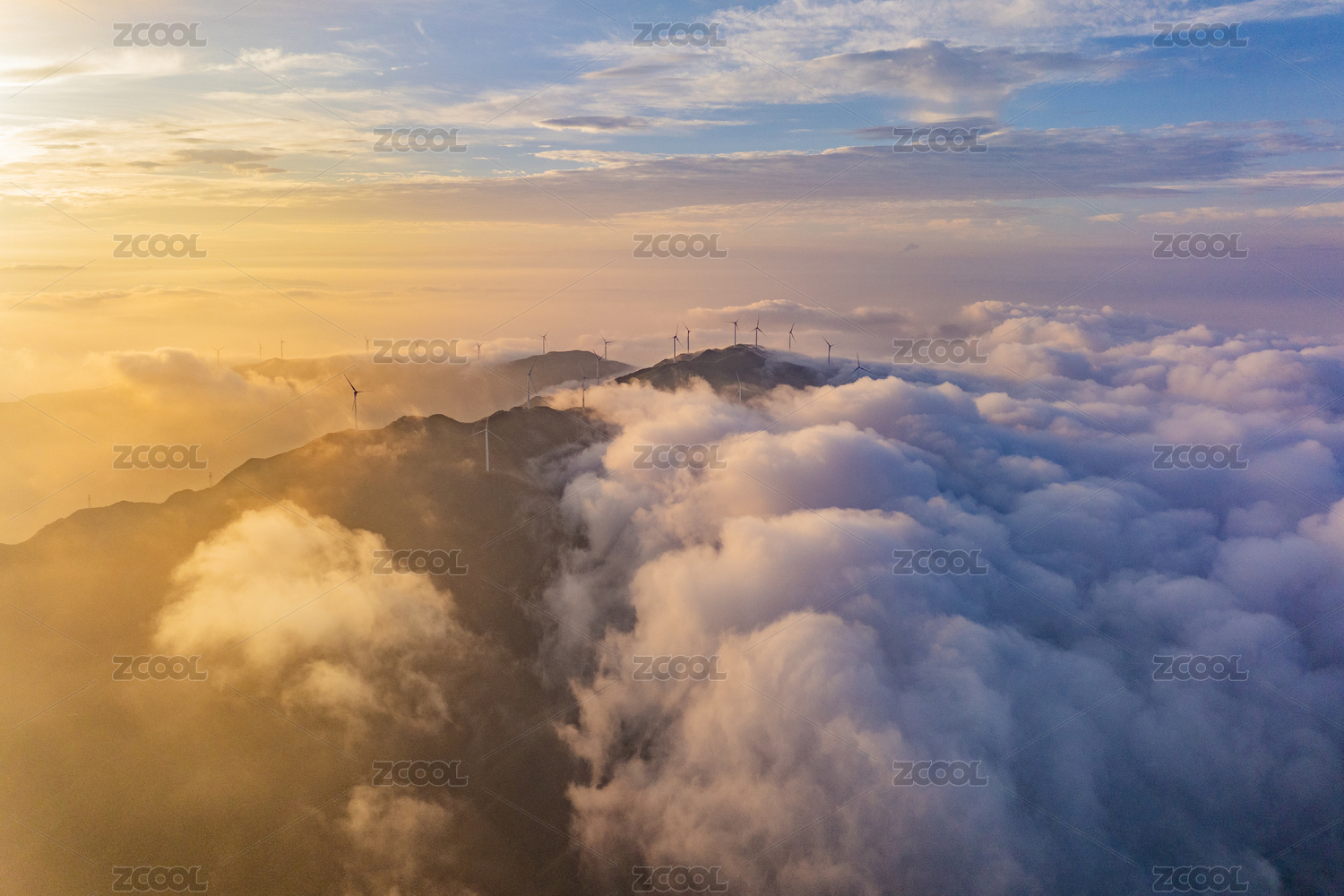 清晨云海之上的中国福建省龙岩市红尖山与隐约可见的电线塔架