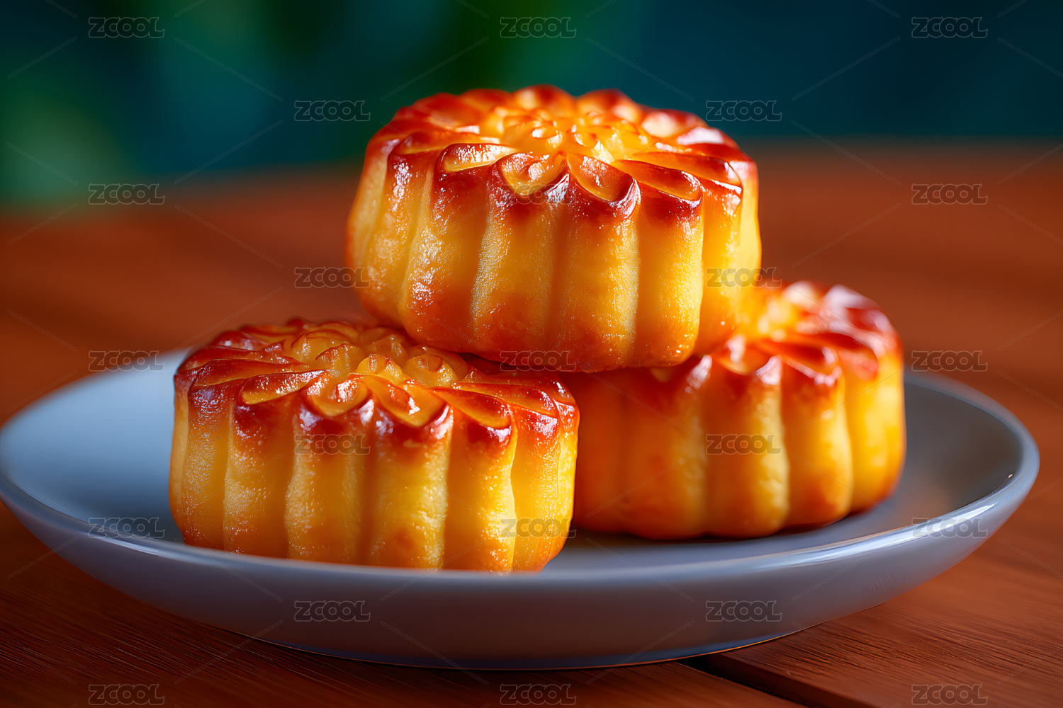 精致月饼摆放于木质托盘