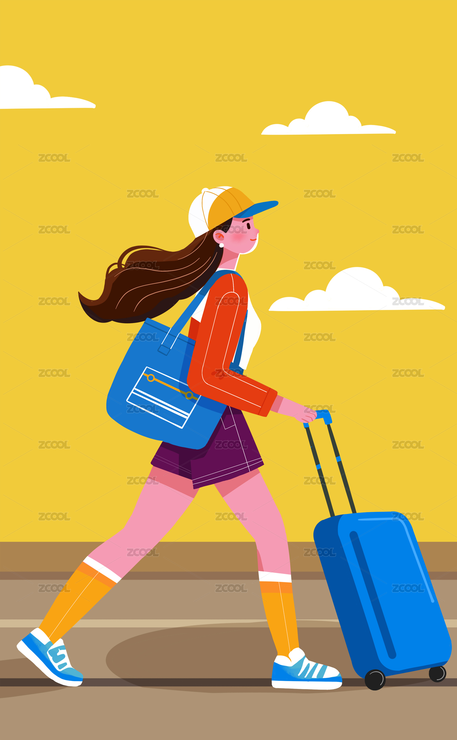 扁平风格卡通手拉行李箱奔跑的女孩插画素材