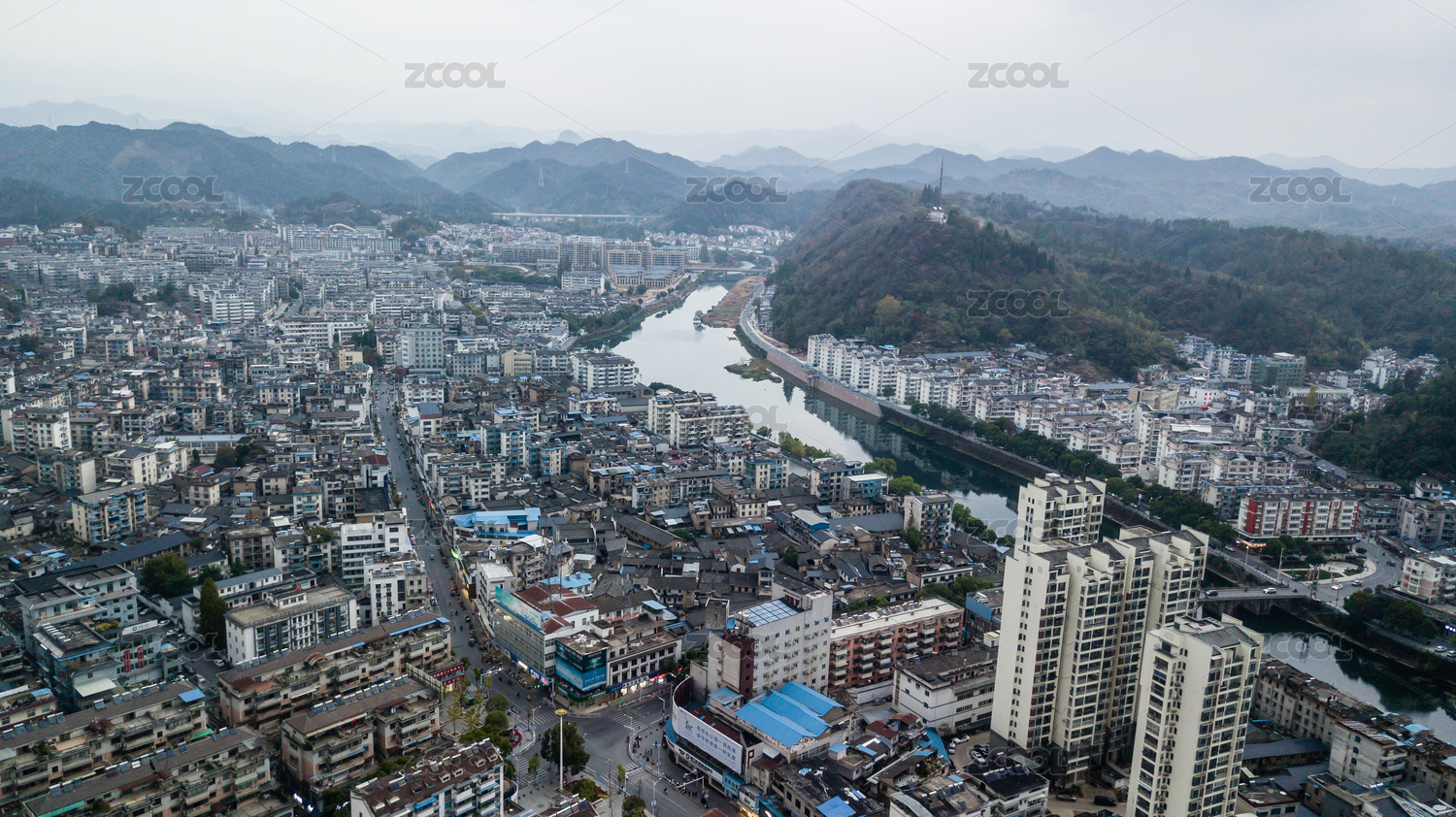 航拍湖北英山温泉镇山城美景