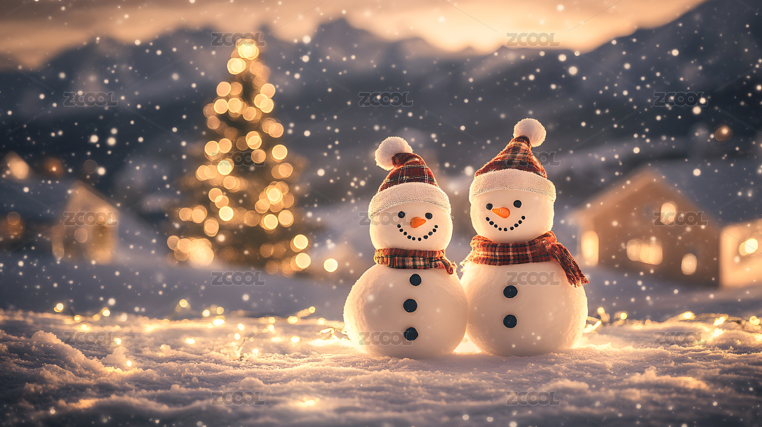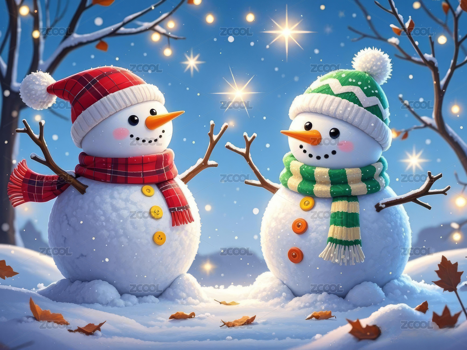 温暖,冬季,插画,卡通,冬日,雪景,两个,雪人,帽子,围巾