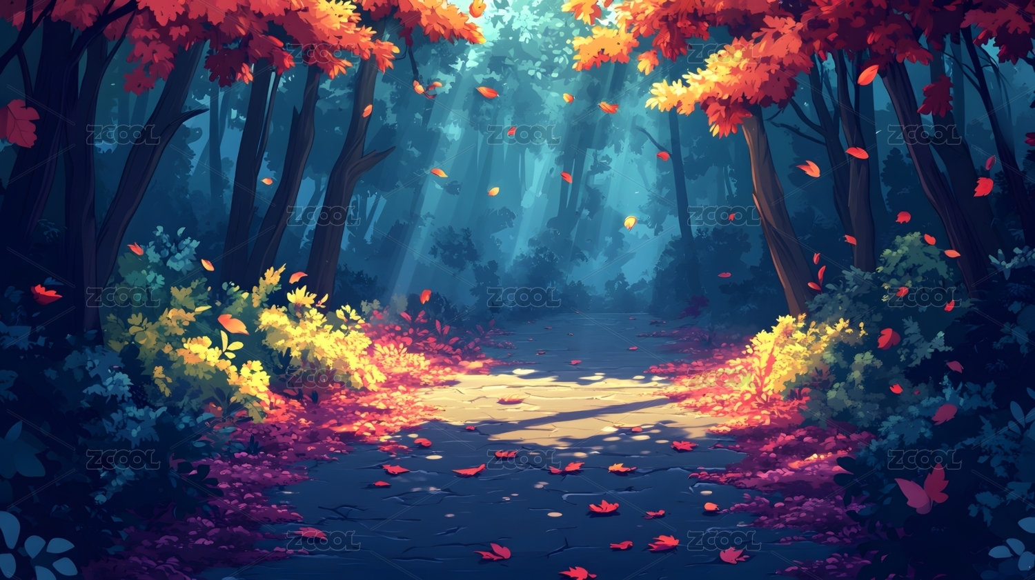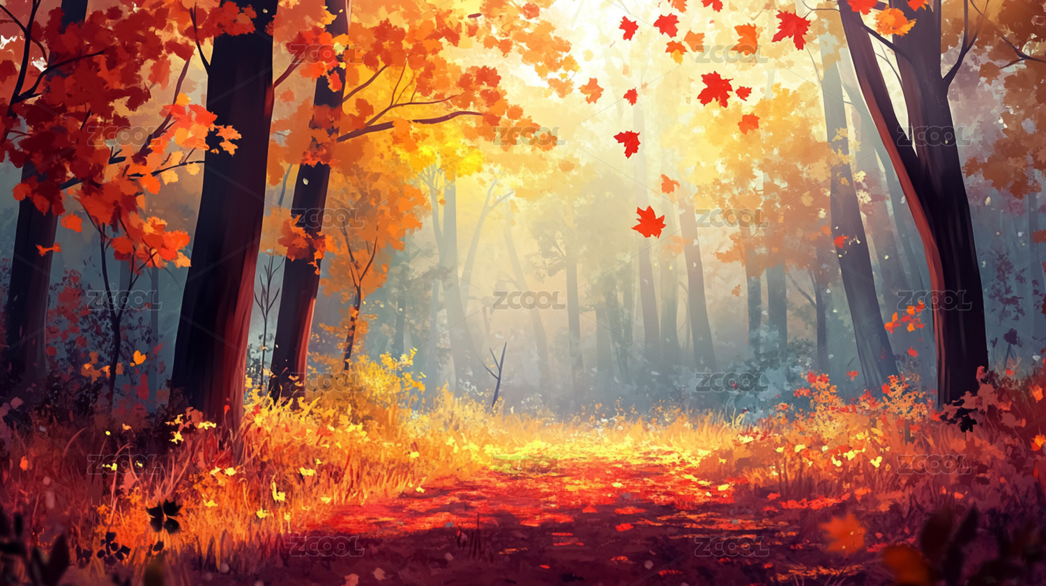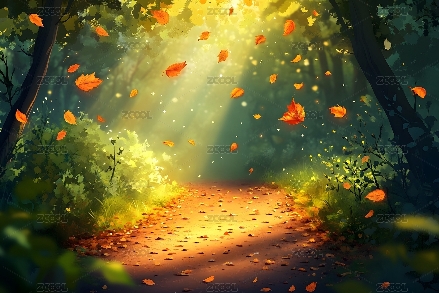 秋天阳光下森林里的梧桐树叶黄色落叶风景