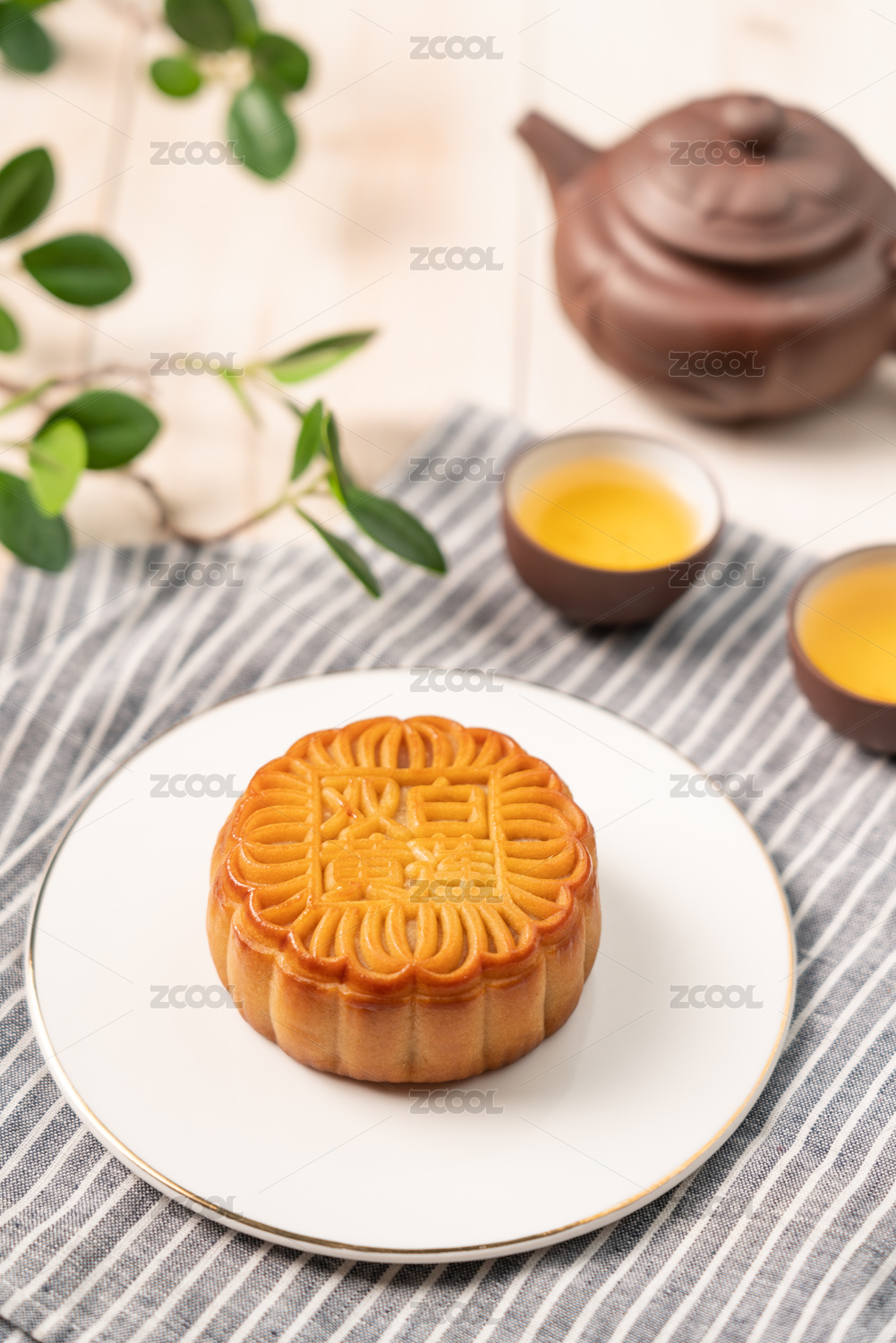 中式圆木纹桌子上的月饼