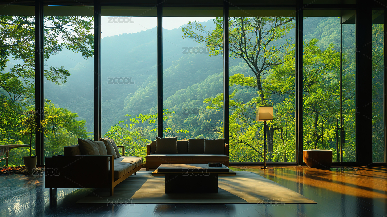 现代简约客厅,窗外山景一览无余