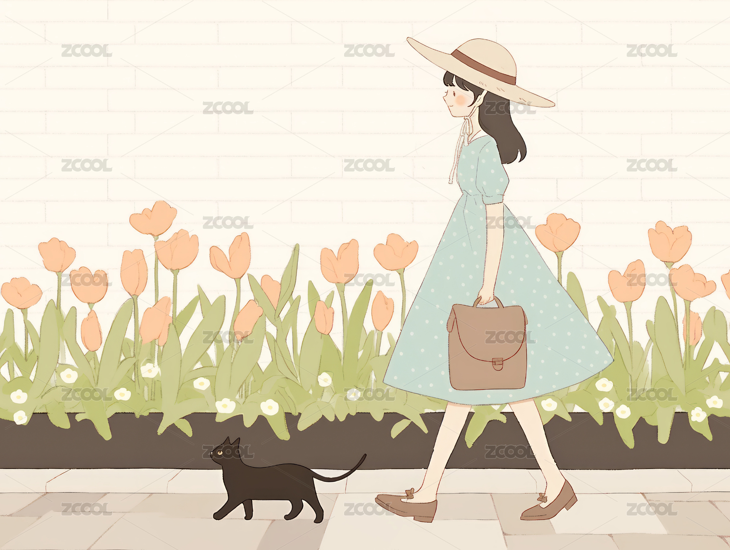 扁平插画一个女孩和猫走在满是花朵的小路上