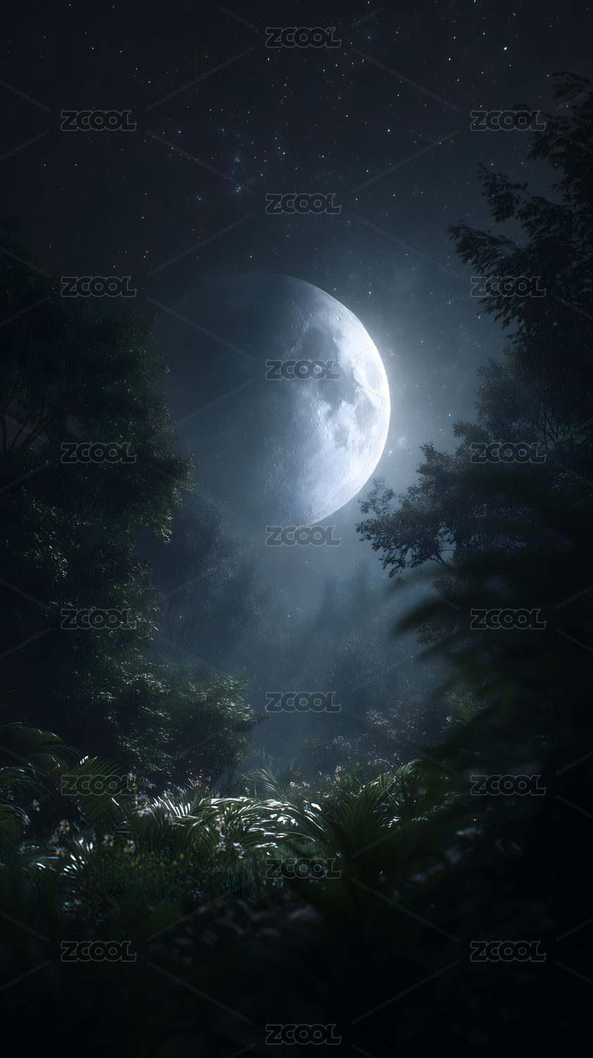 梦幻月夜湖中岛静谧夜色朦胧岛屿