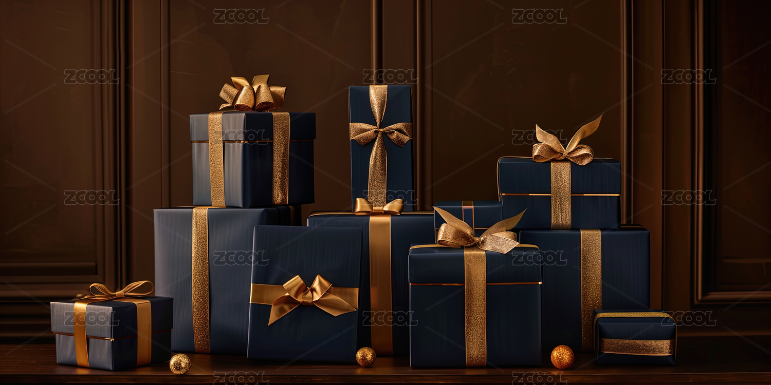 深蓝色礼盒金色丝带堆叠背景