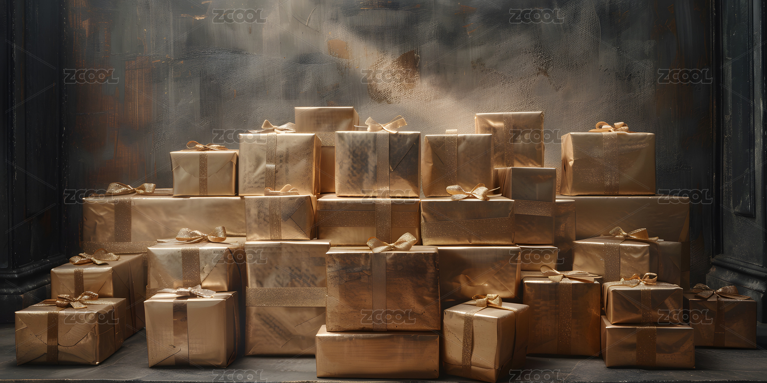 金色礼物堆叠在深色背景墙前