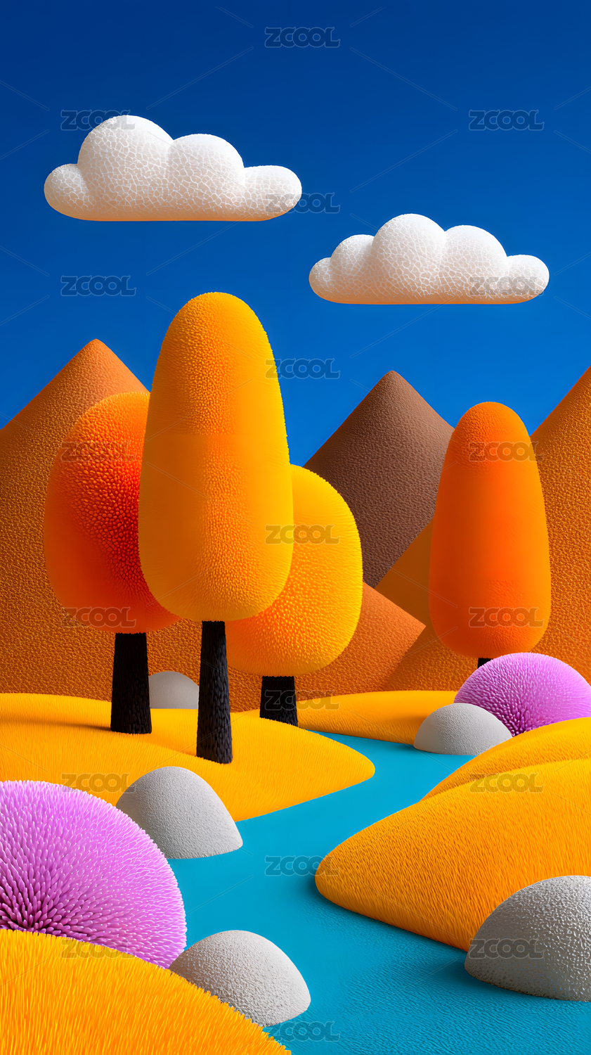 绿色绒毛山丘与棉花云朵的梦幻景观