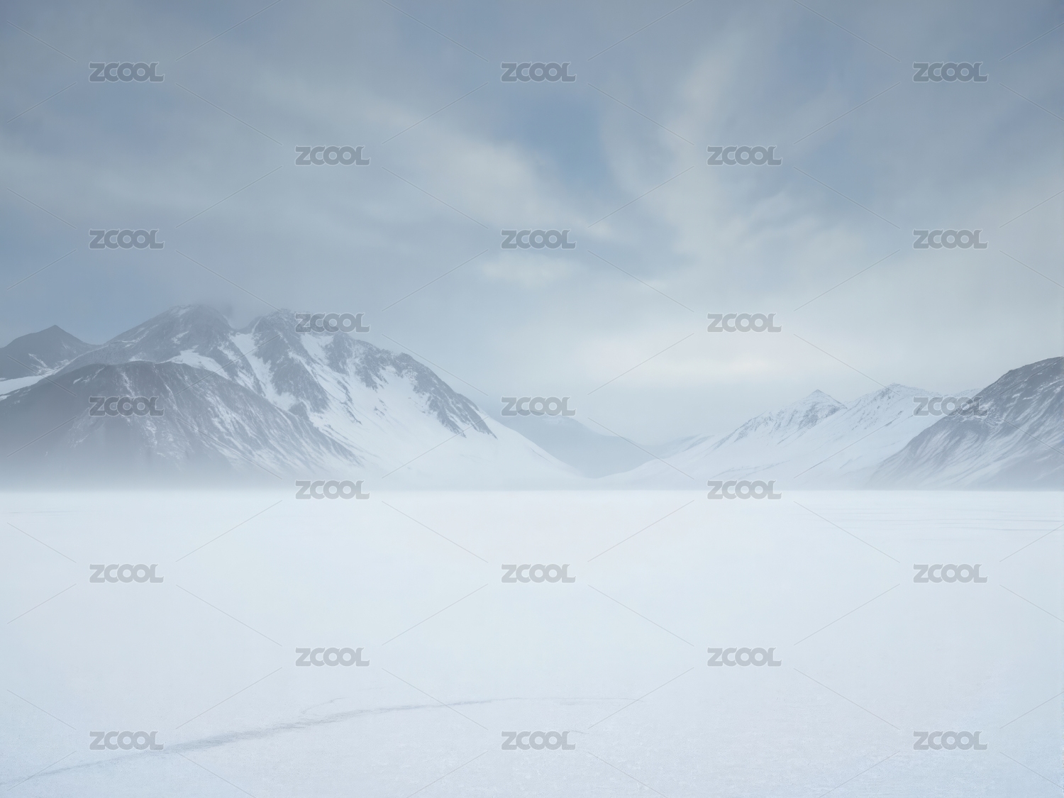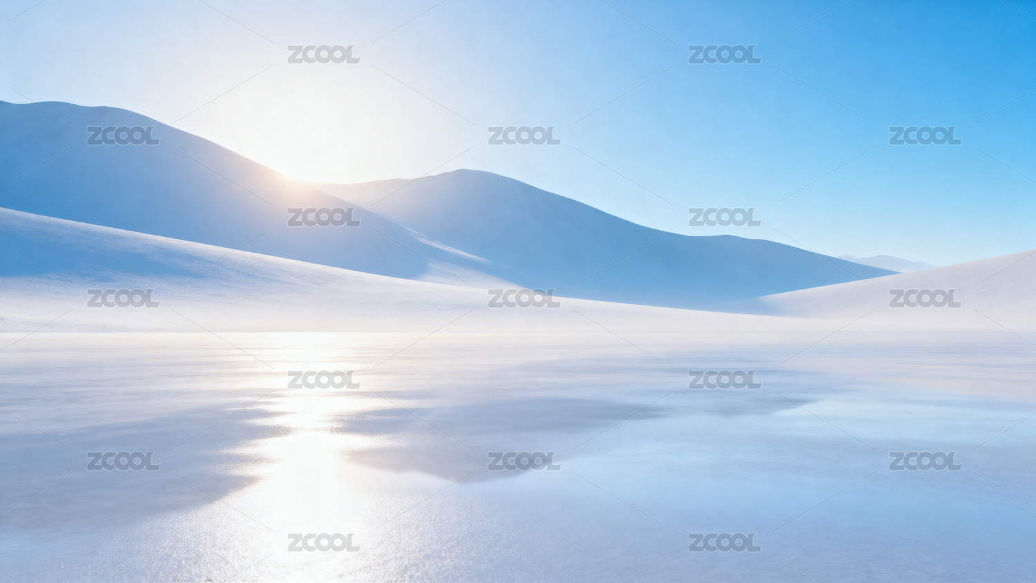 冬天日出时分松花湖上冰面雪地远山晨雾