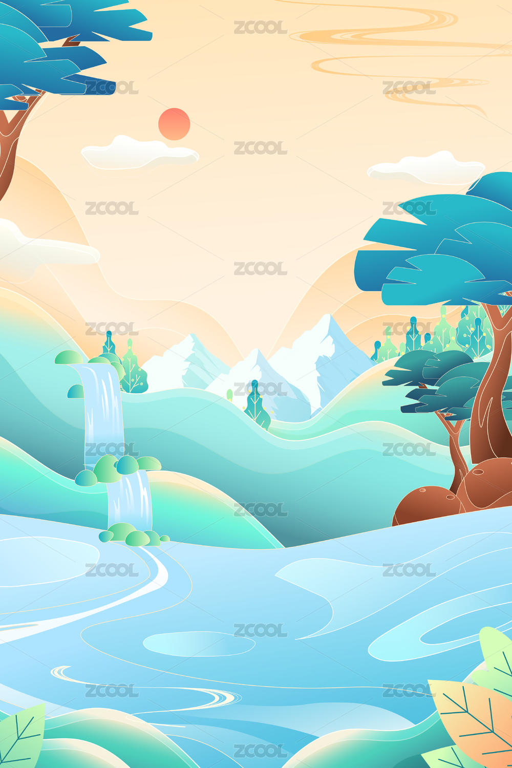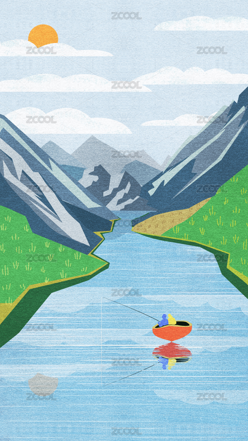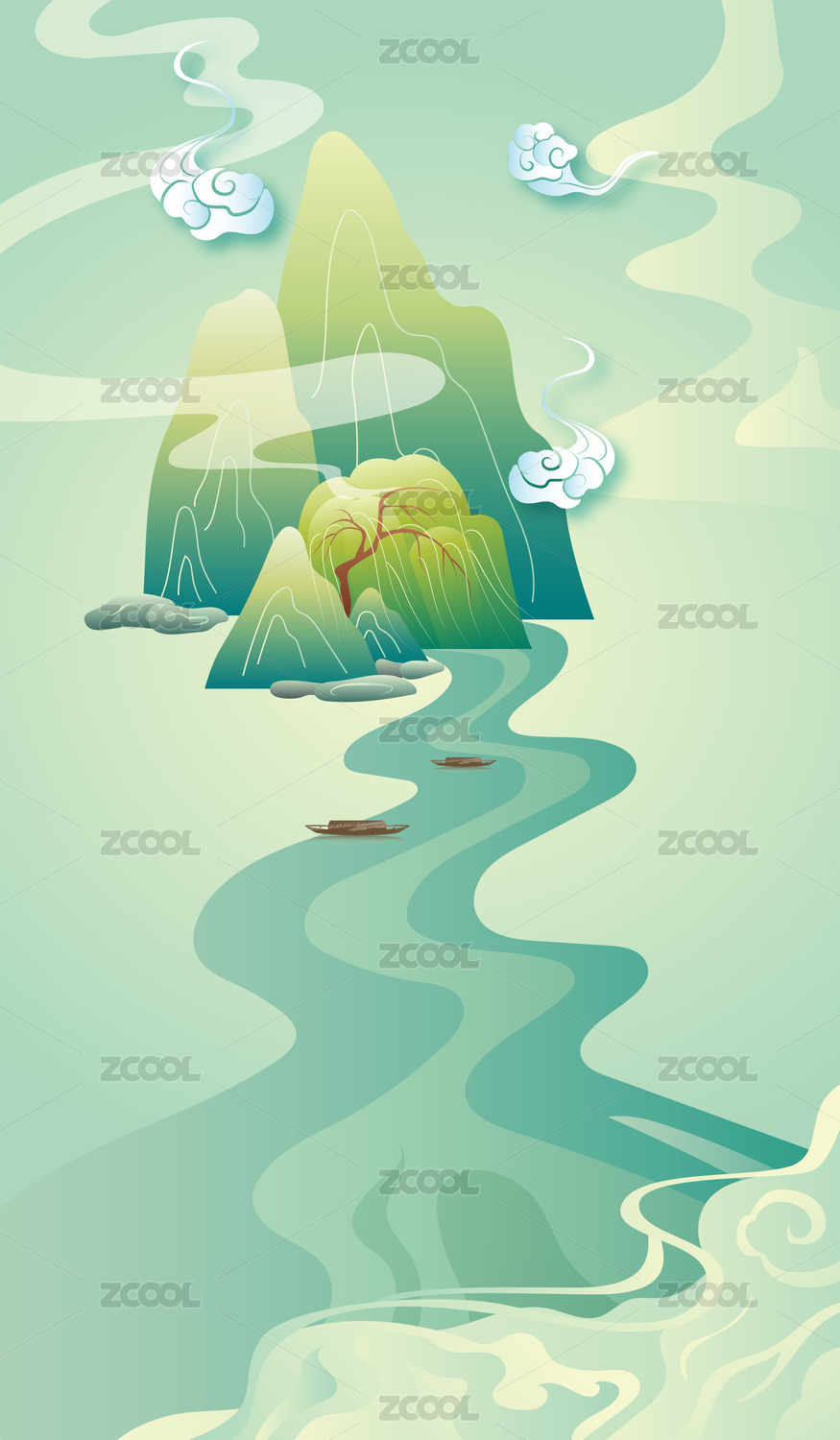 卷轴山水画中国风复古山峰风景旅游矢量插画