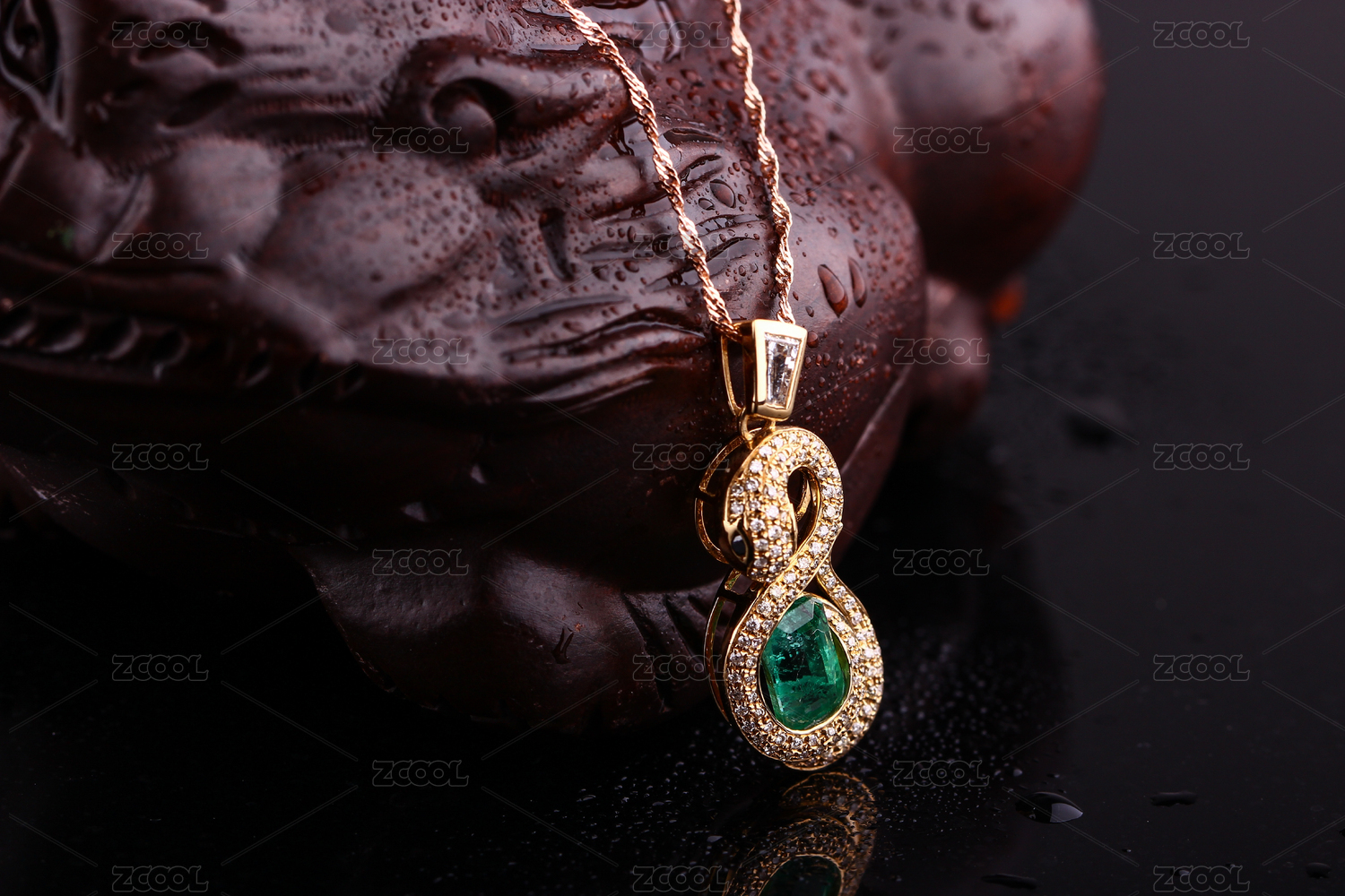祖母绿宝石吊坠18K金晶亮的项链放在中式复古深色的背景里