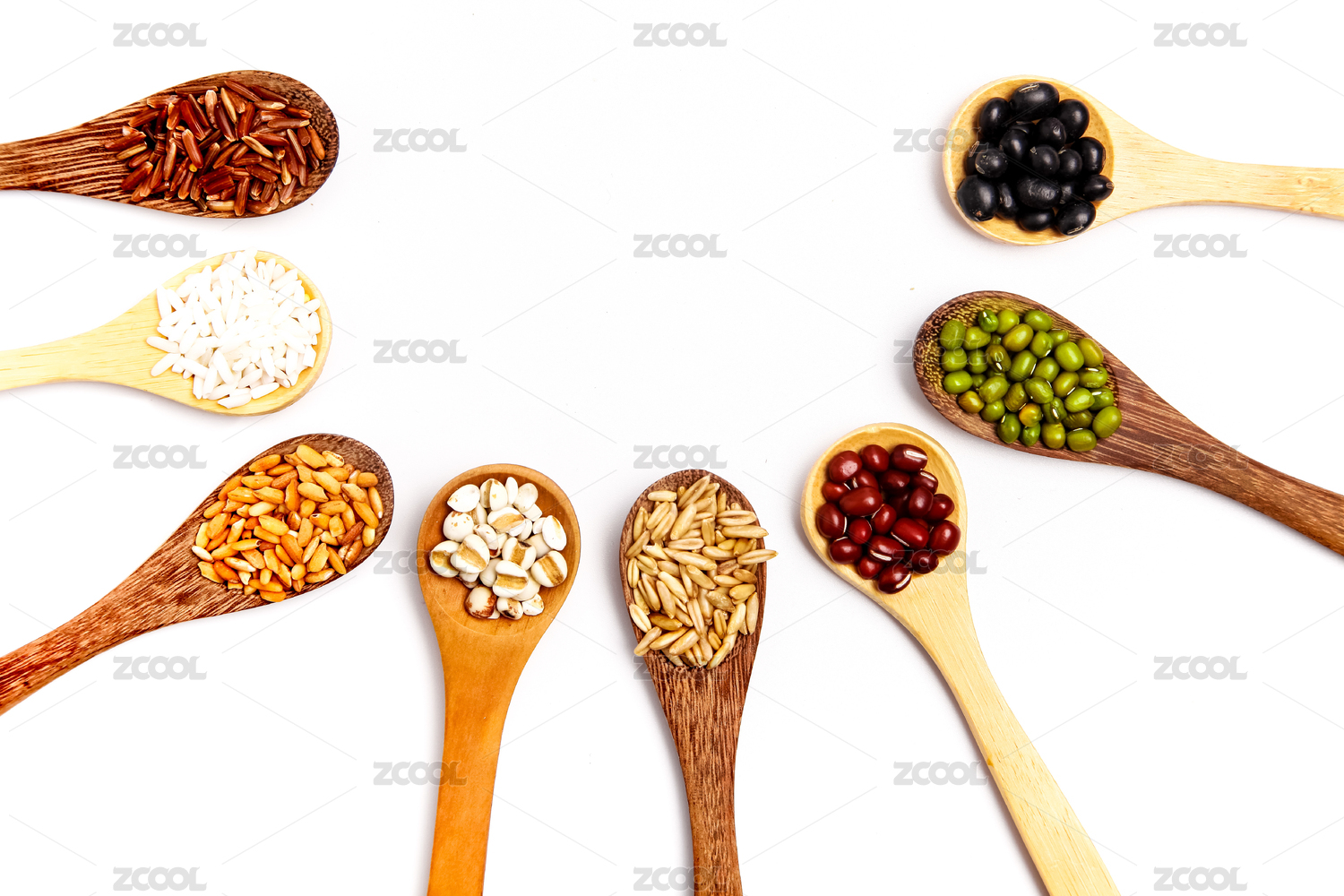 白底上装在勺子里的粗粮组合