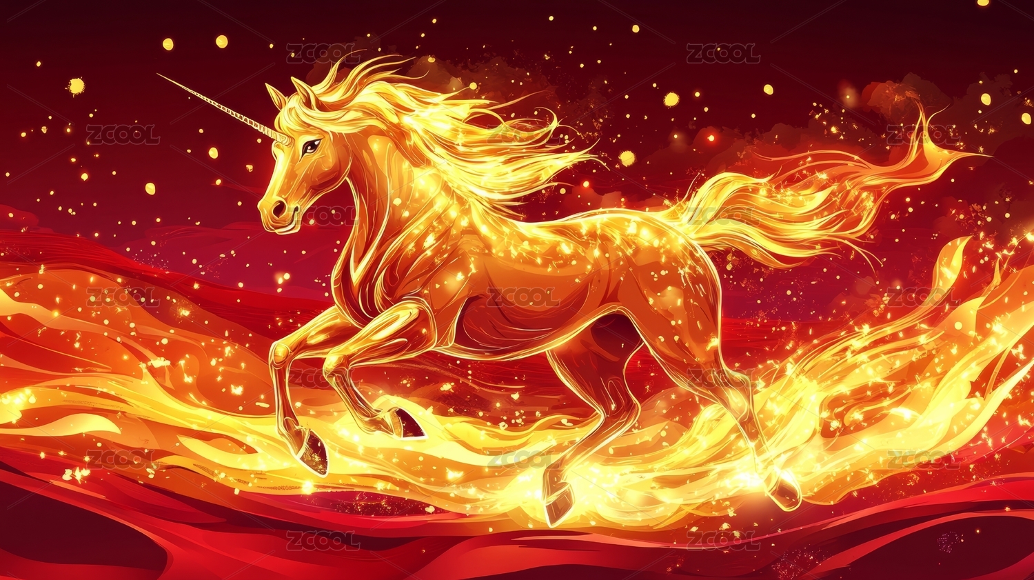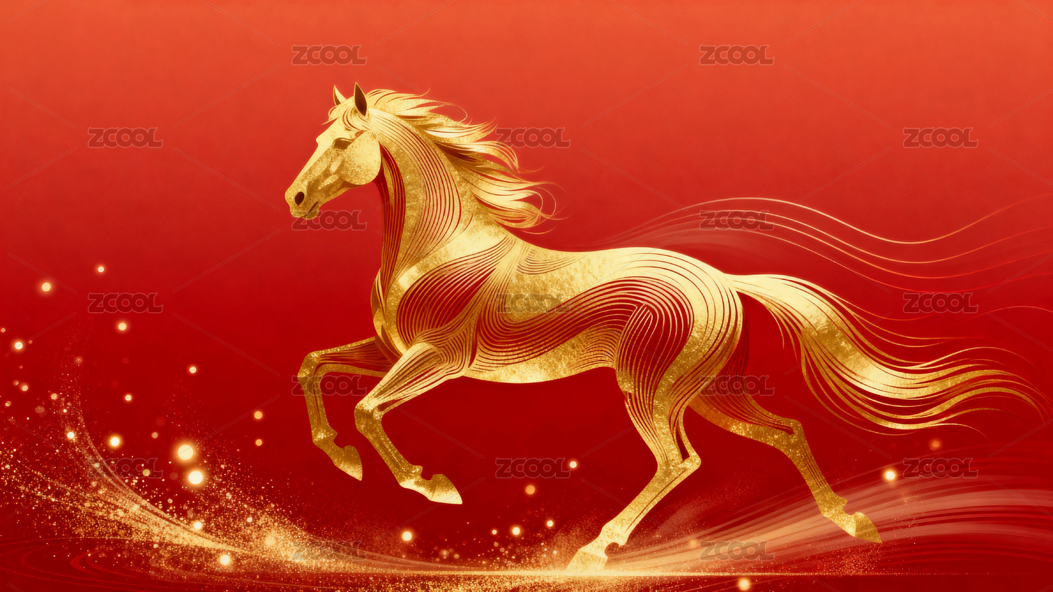 金色骏马奔腾于红底之上
