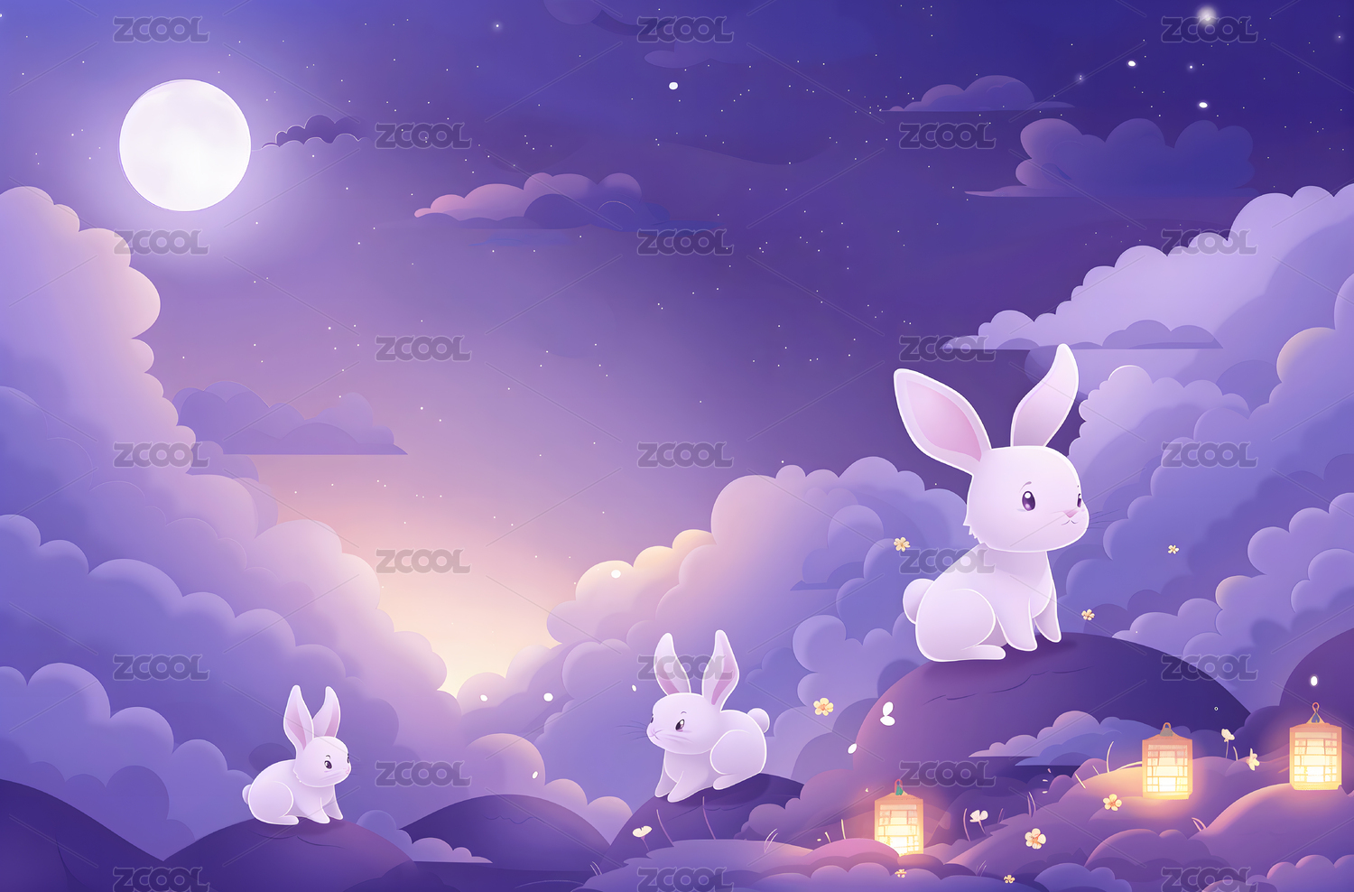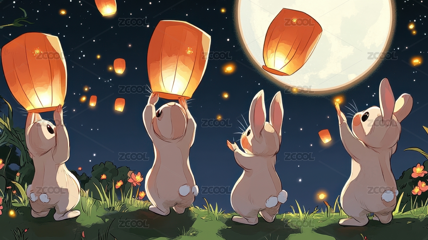 中秋节海报插画3只兔子在放孔明灯祈愿