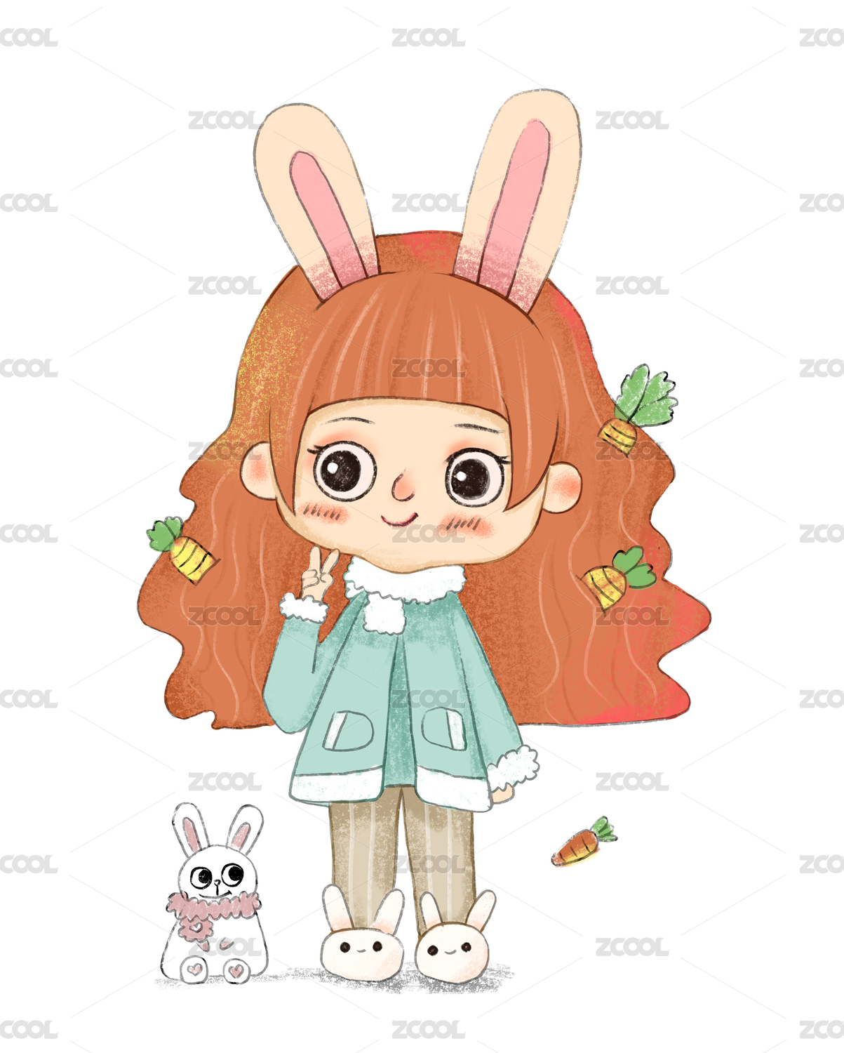 原创插画 萌系小可爱 抱着兔子音乐小女孩