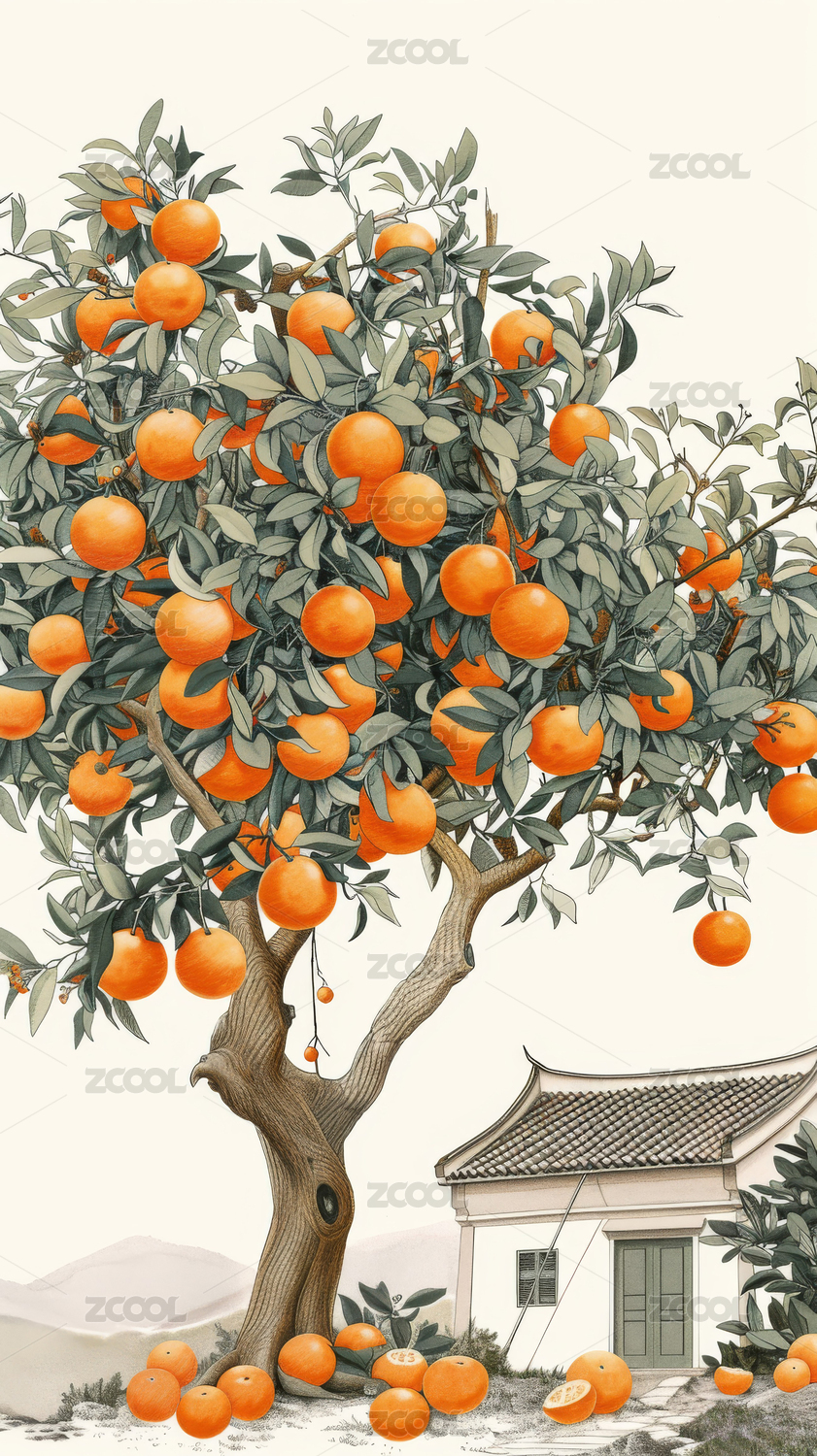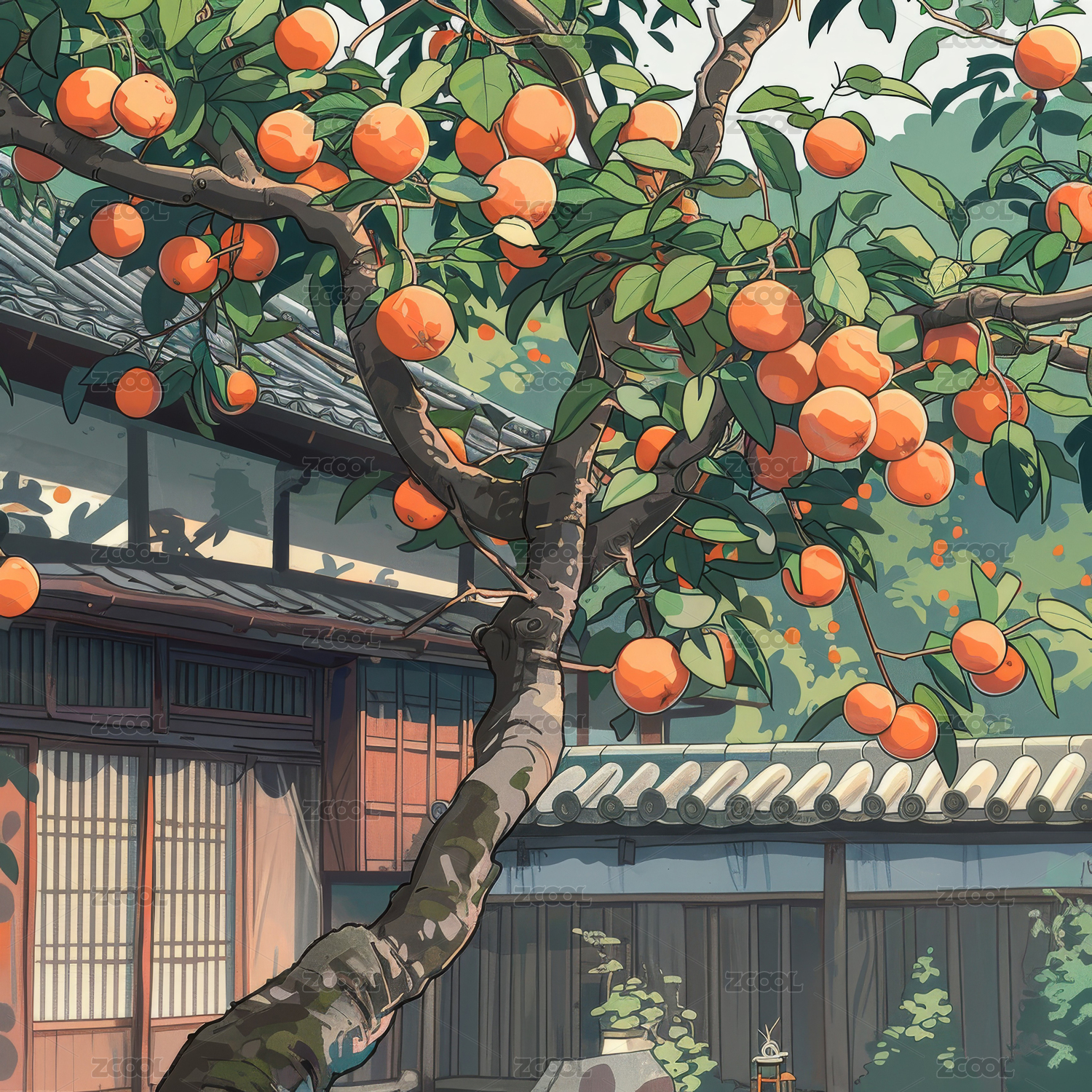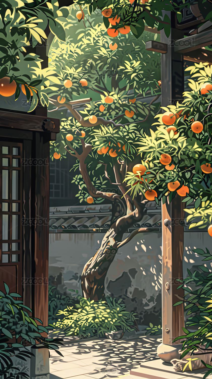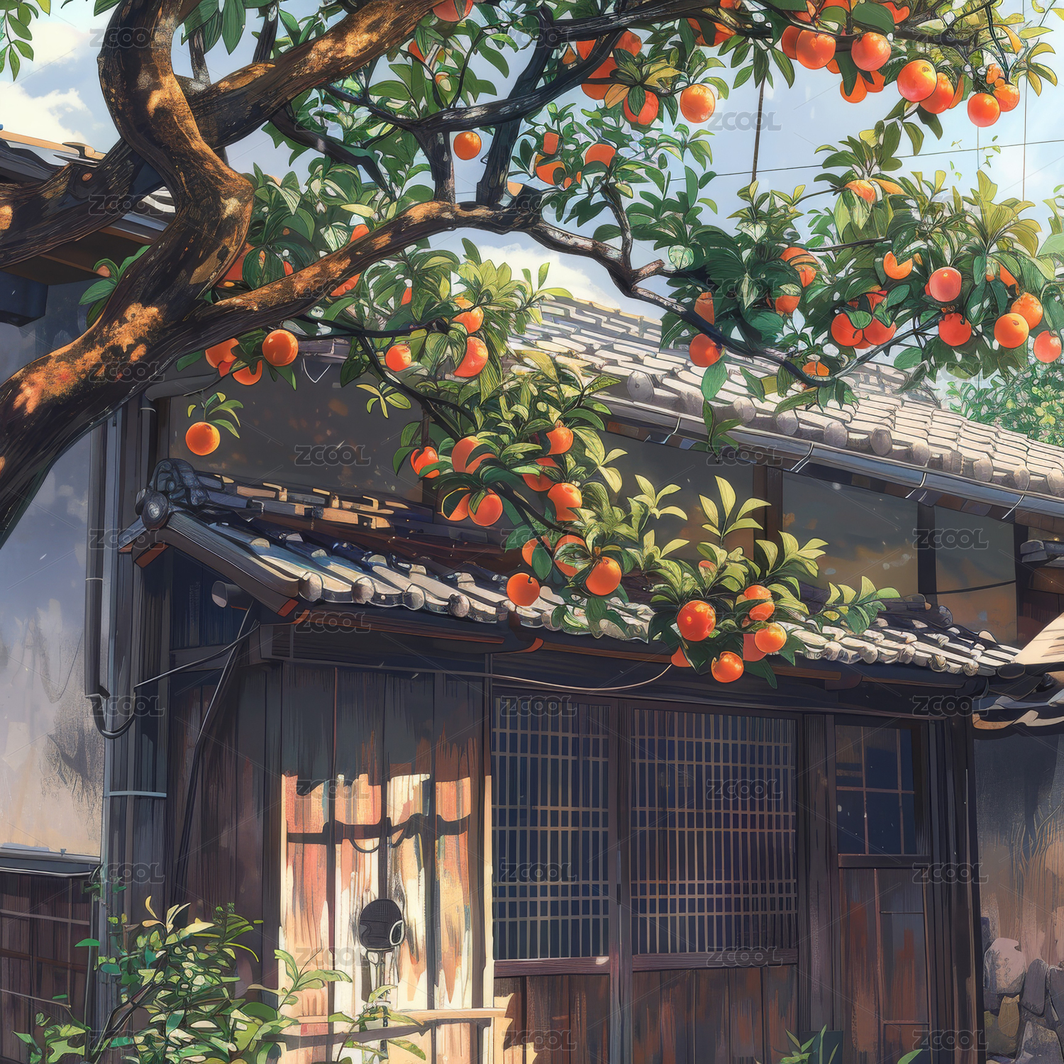 AIGC202402,插画,户外,手绘,植物,自然,水彩画,屋檐,小院,叶子