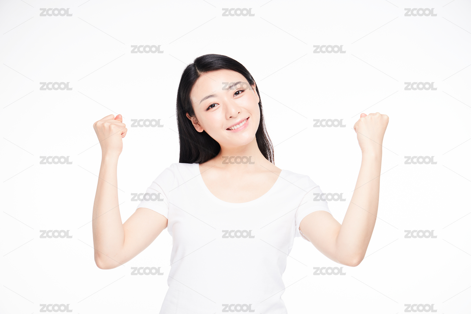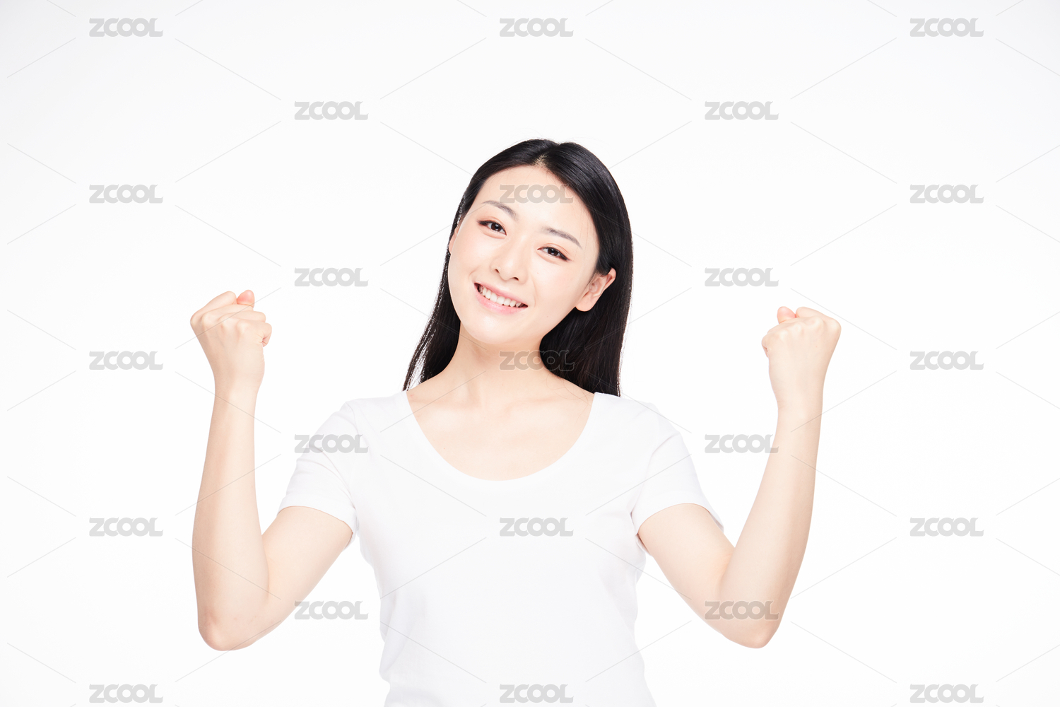一位美丽的亚裔女孩站在纯色背景双手戳酒窝眯着眼睛微笑