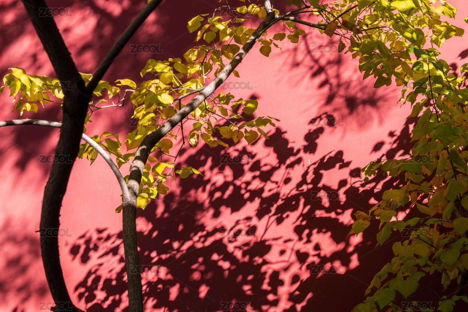 秋天明孝陵红色宫墙外的金黄色银杏树叶