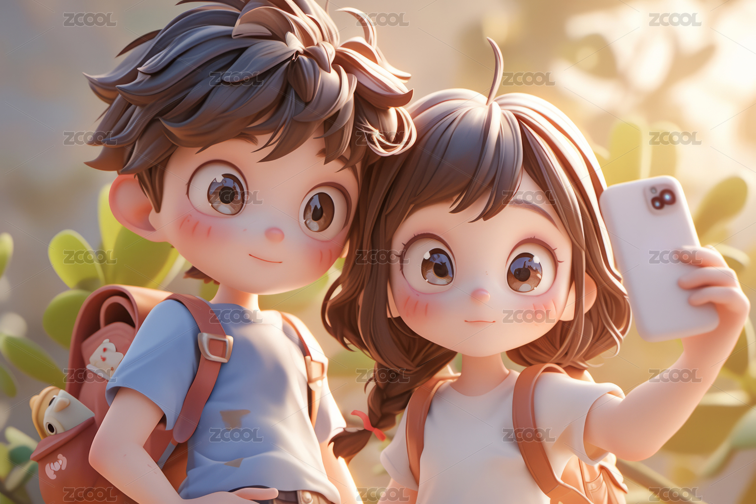 卡通,3D,可爱,情侣,手机,自拍,户外,插画,aigc,两个人